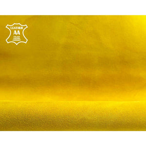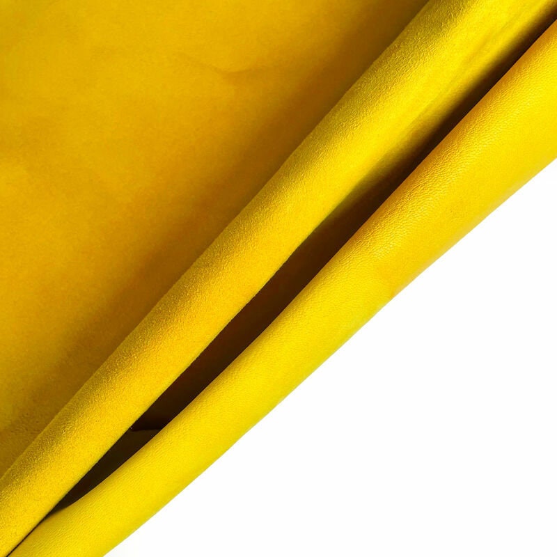 - Bright yellow suede leather pieces. Yellow velour material. Natural lambskin hides from the best Italian tannery. Perfect leather for sewing.