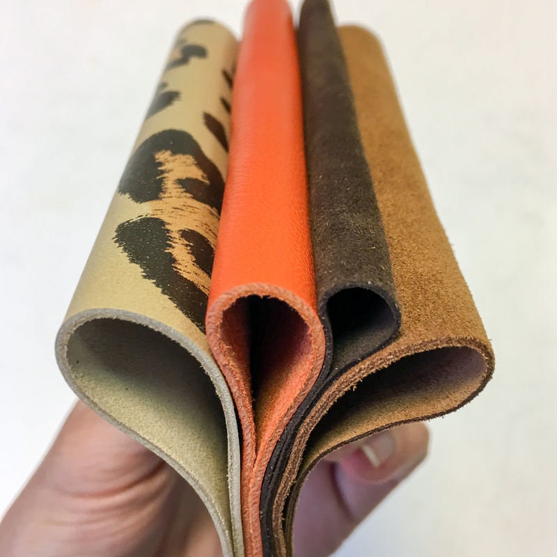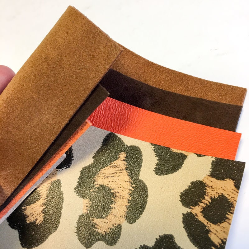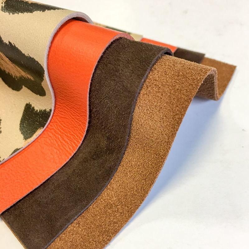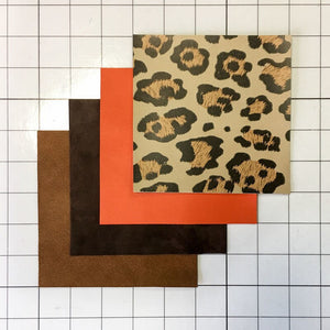 JAGUAR MIX leather pre cut sheet set - nappa leather, suede sheets and leather print piece with FREE SHIPPING Worldwide. 4 quality leather pieces 5x5 inch - 2 brown suede pieces, bright orange nappa sheet and brown JAGUAR leather print leather sheet 4pack, perfect leather sheets for crafts. Best choice for your project!