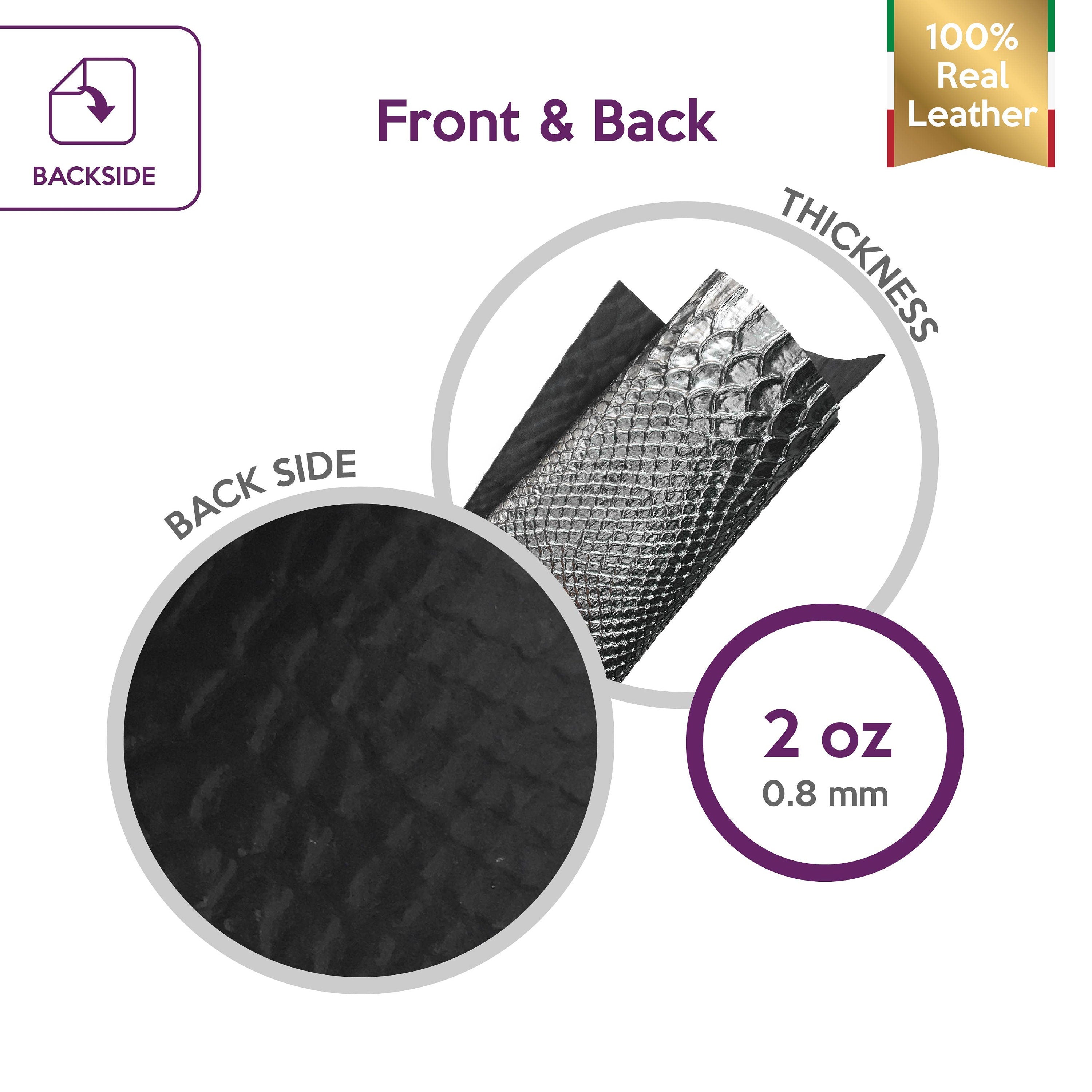 -These dark silver lambskin pieces will be perfect as a supplies for leather jewellery. Scraps are covered with snake skin texture. Pieces are little bit stiff, but nice and hard leather fabric in shiny silver color. Backside is clean and colored black.