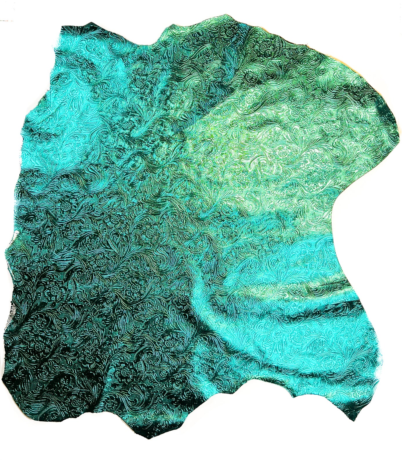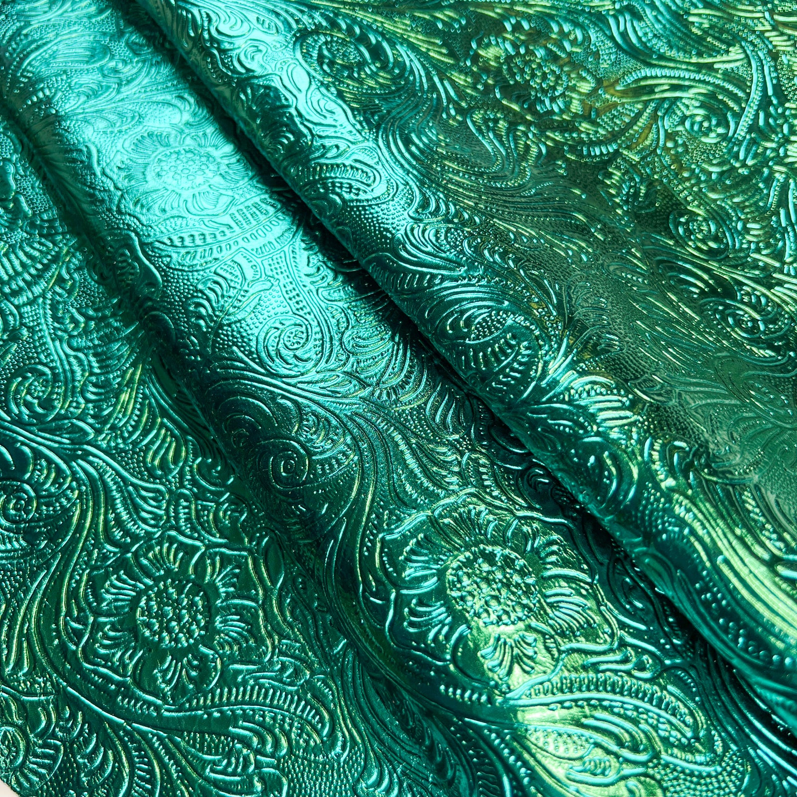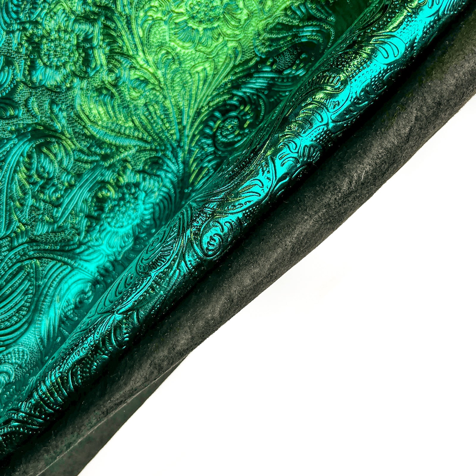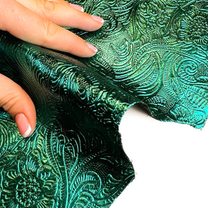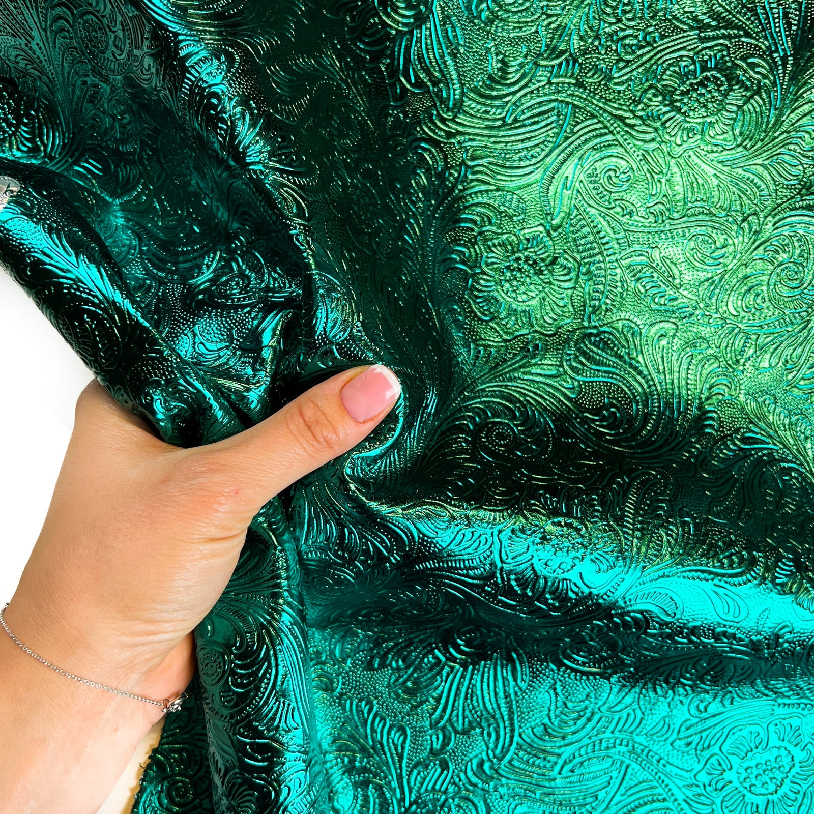 Metallic emerald green lambskin gold leather with flower print. Shiny textured hides. Amazing leather for bag and purse crafters will be long-lasting. Our mission is to provide only the highest quality Italian leather to other leather workers, crafters of all kinds, small businesses, or shops for your projects.