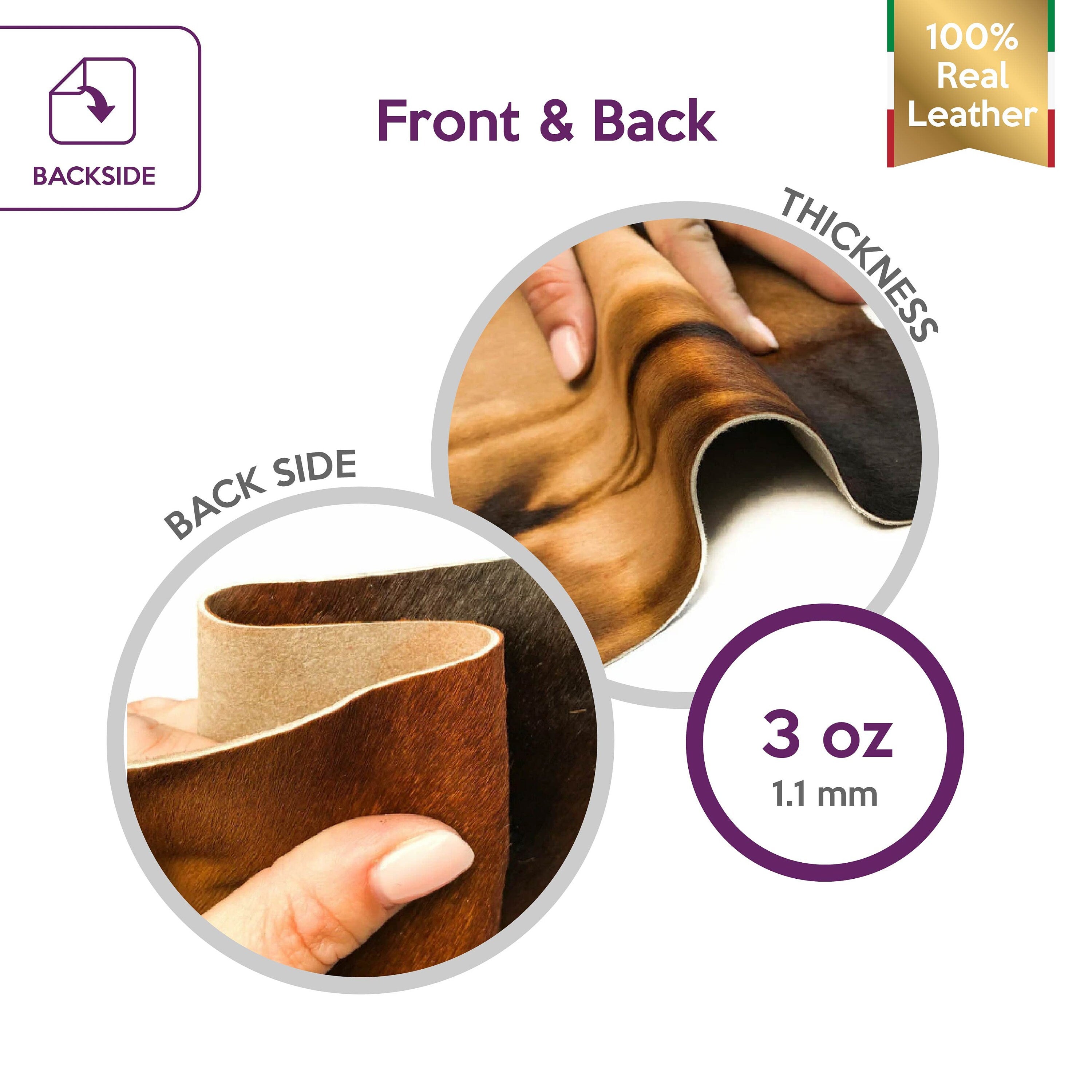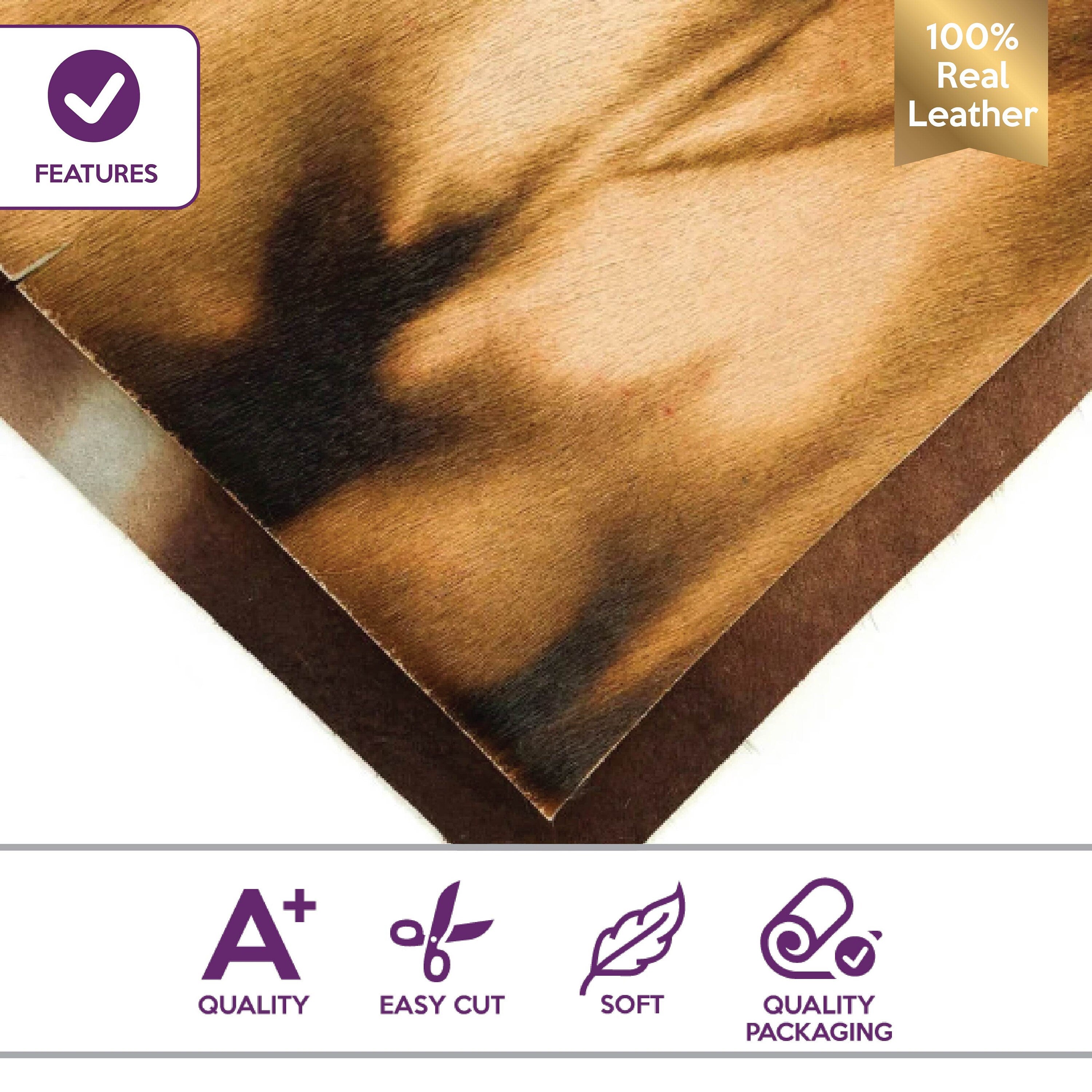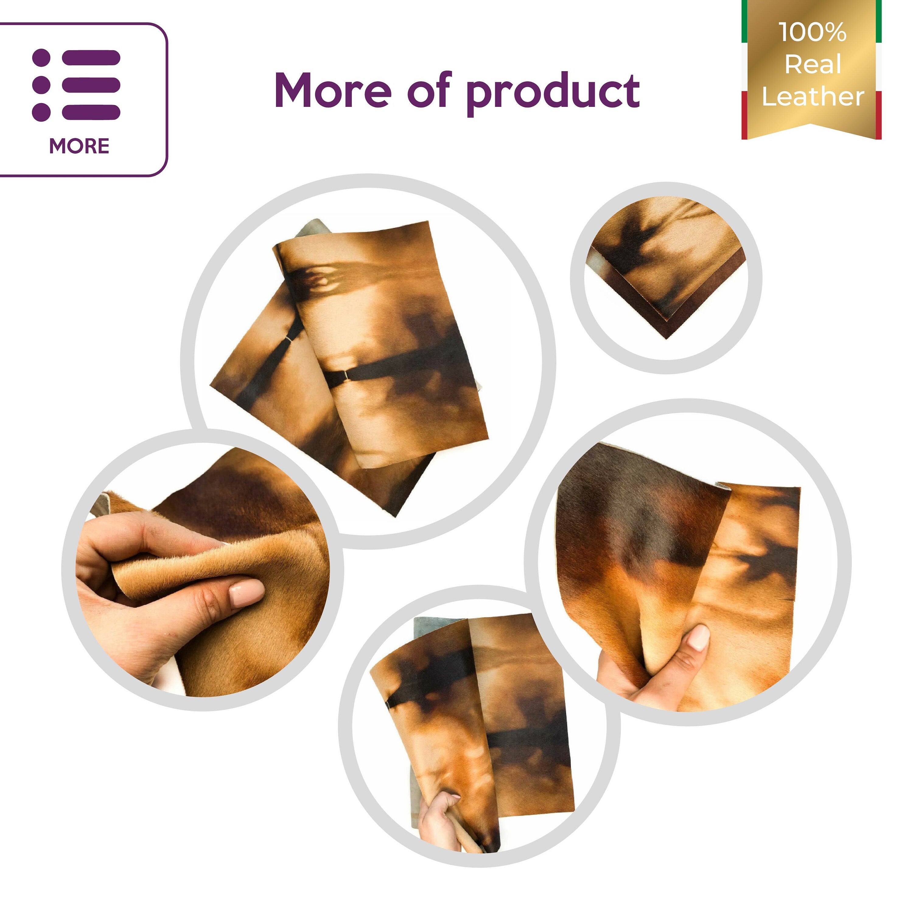 High-quality genuine pony leather fabric sheets in brown and beige colors. Soft fur leather material pieces for your best projects! Our mission is to provide only the best quality Italian leather samples to other leather workers, crafters of all kinds, small businesses, or Etsy shop for your projects.