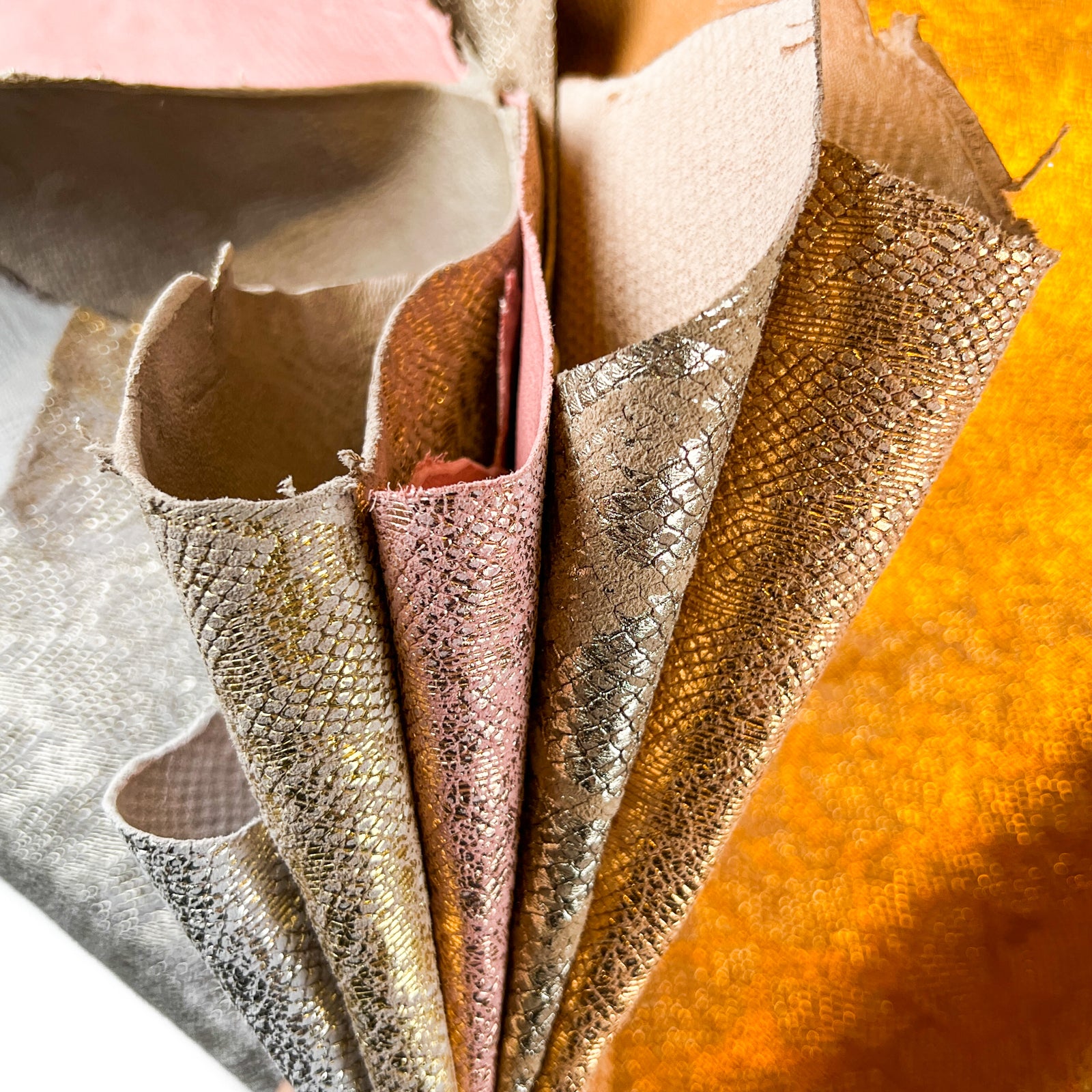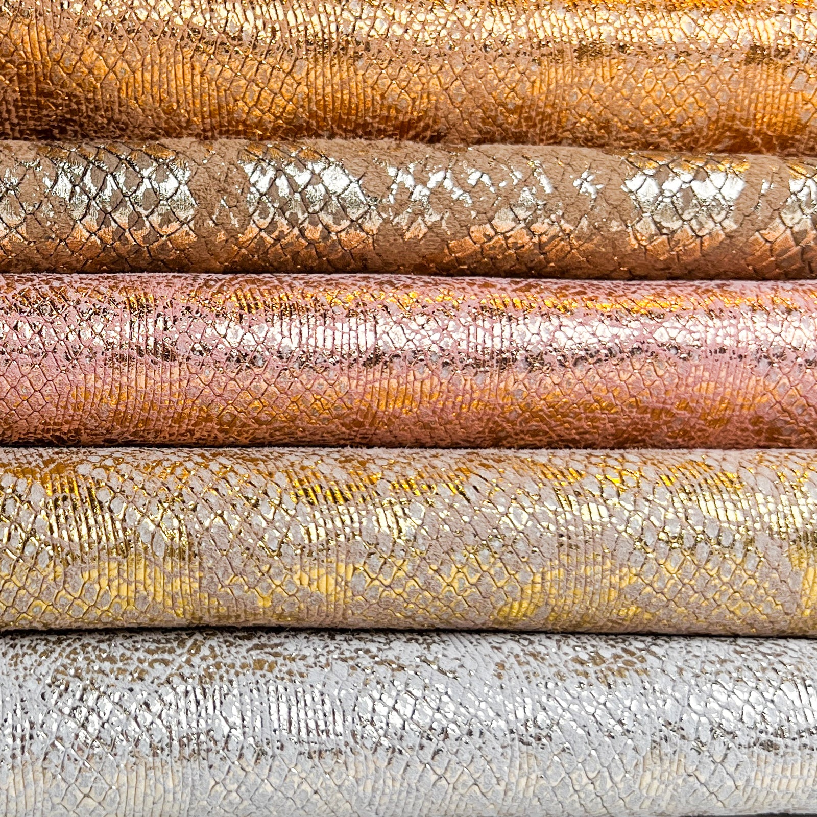- Orange, beige, pink, gold, silver metallic leather with golden snake mix print. Gold print all over the hides. Leather will be perfect for all kind of diy jewelry. High quality Italian lambskin.