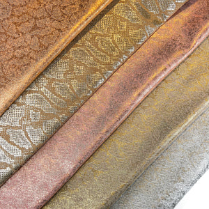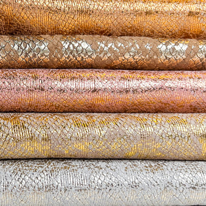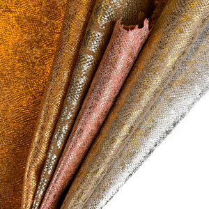 High-quality lambskin leather hides with golden snake mix print. Shiny metallic leather with animal print for your best projects! Our mission is to provide only the best quality Italian leather samples to other leather workers, crafters of all kinds, small businesses or Etsy shop for your own projects.