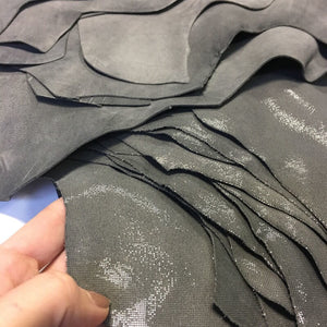 Elegant leather in classic gray tone, very pleasant on touch. Soft lightweight genuine suede, quite thin, flowy leather with sparkle. Backside is same color, with visible grain. Can be used as double sided.