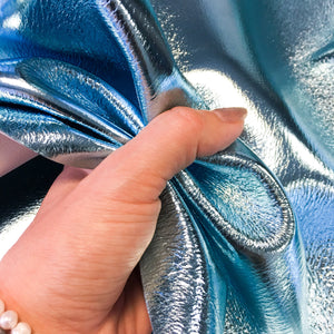 -Sky Blue metallic leather, soft, shiny leather sheets. Durable and beautiful leather material for sewing. Light Blue Topaz coloring - looks like a natural crystal itself. Perfect for earrings, jewelry - can You imagine this light blue shiny material as jacket? OMG!