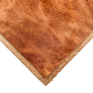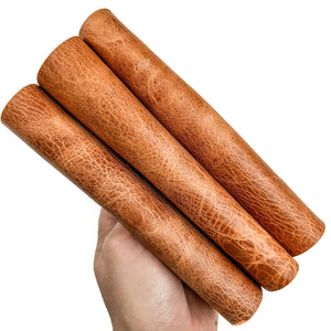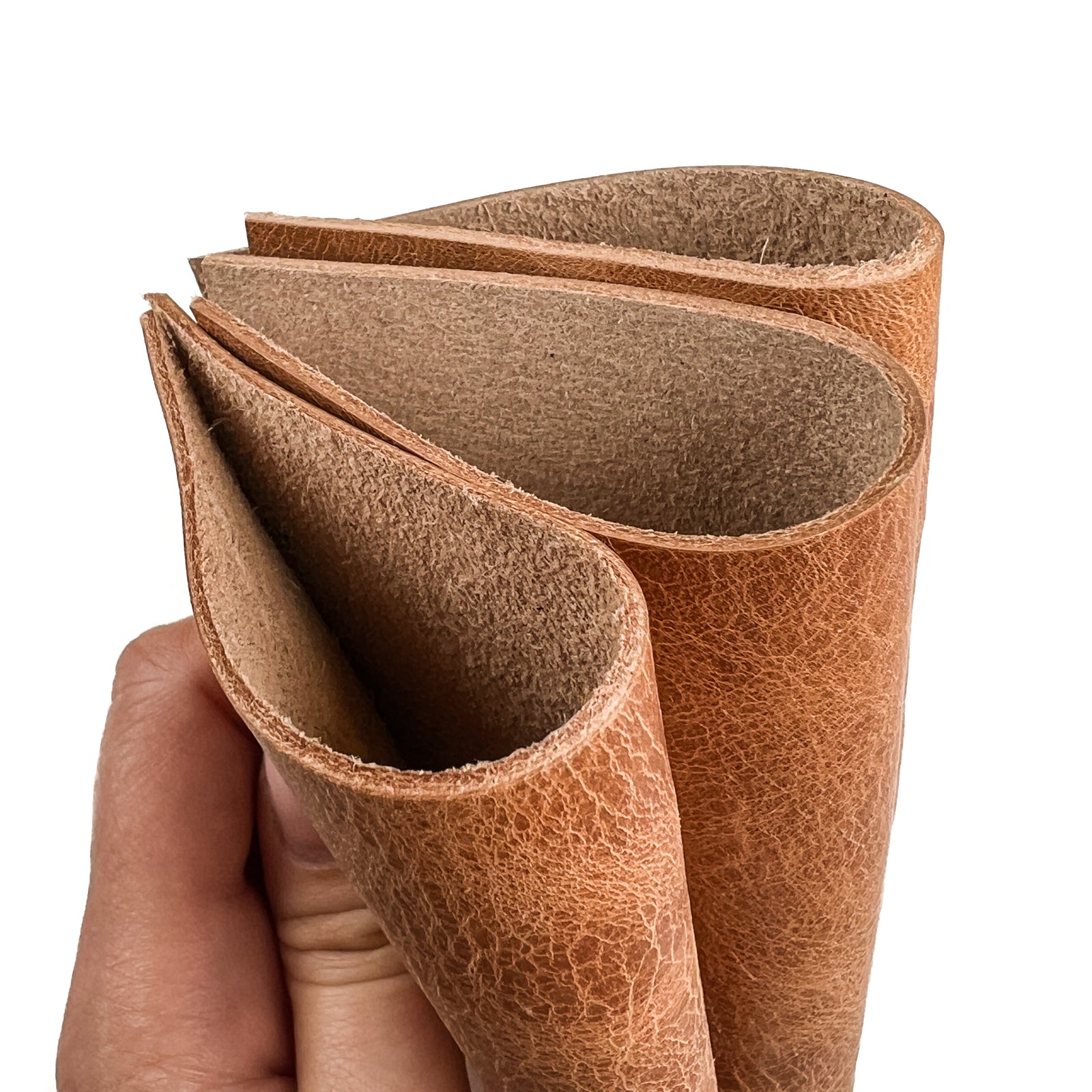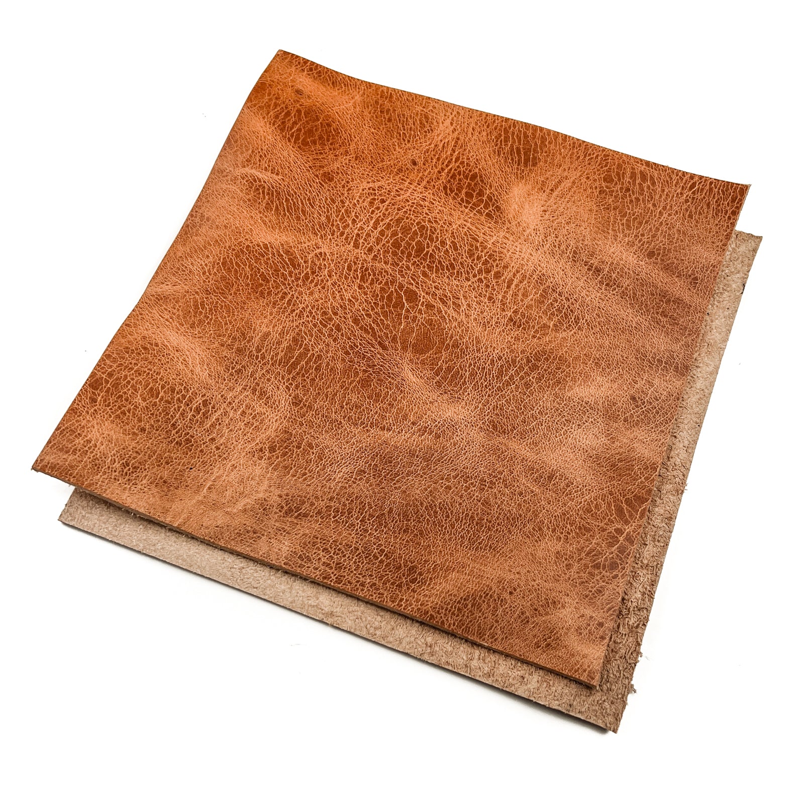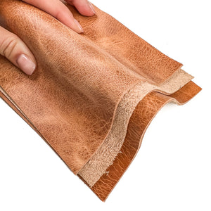 Light brown Vegetable Tan leather sheets with vintage texture. The leather fabric has a textured finish. Amazing leather for bag and purse crafters will be long-lasting. Our mission is to provide only the highest quality Italian leather to other leather workers, crafters of all kinds, small businesses, or shops for your own projects.