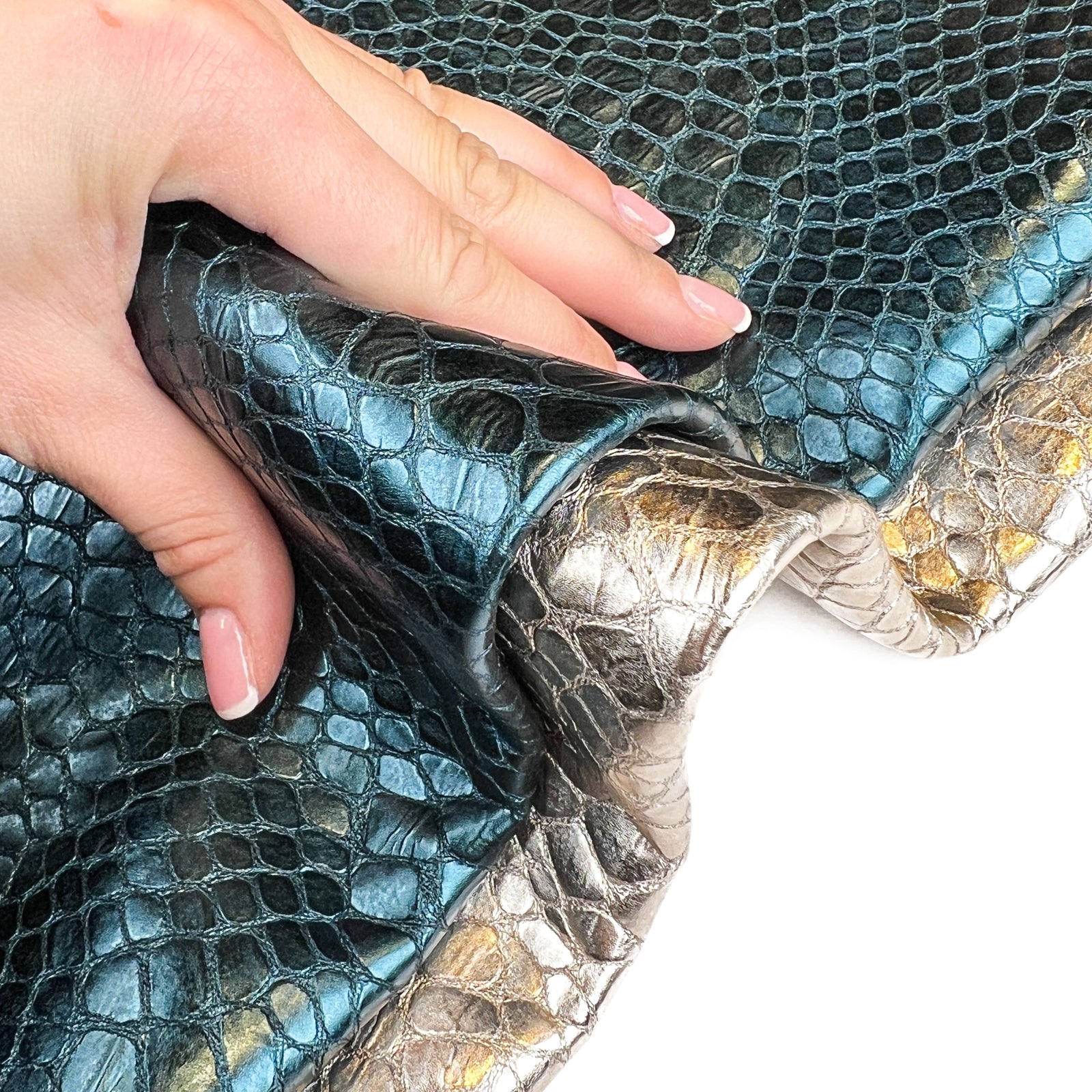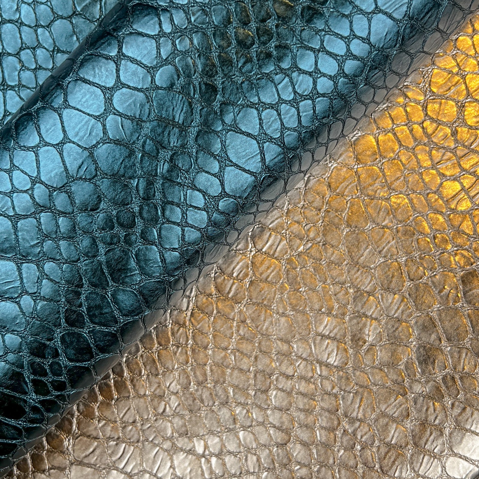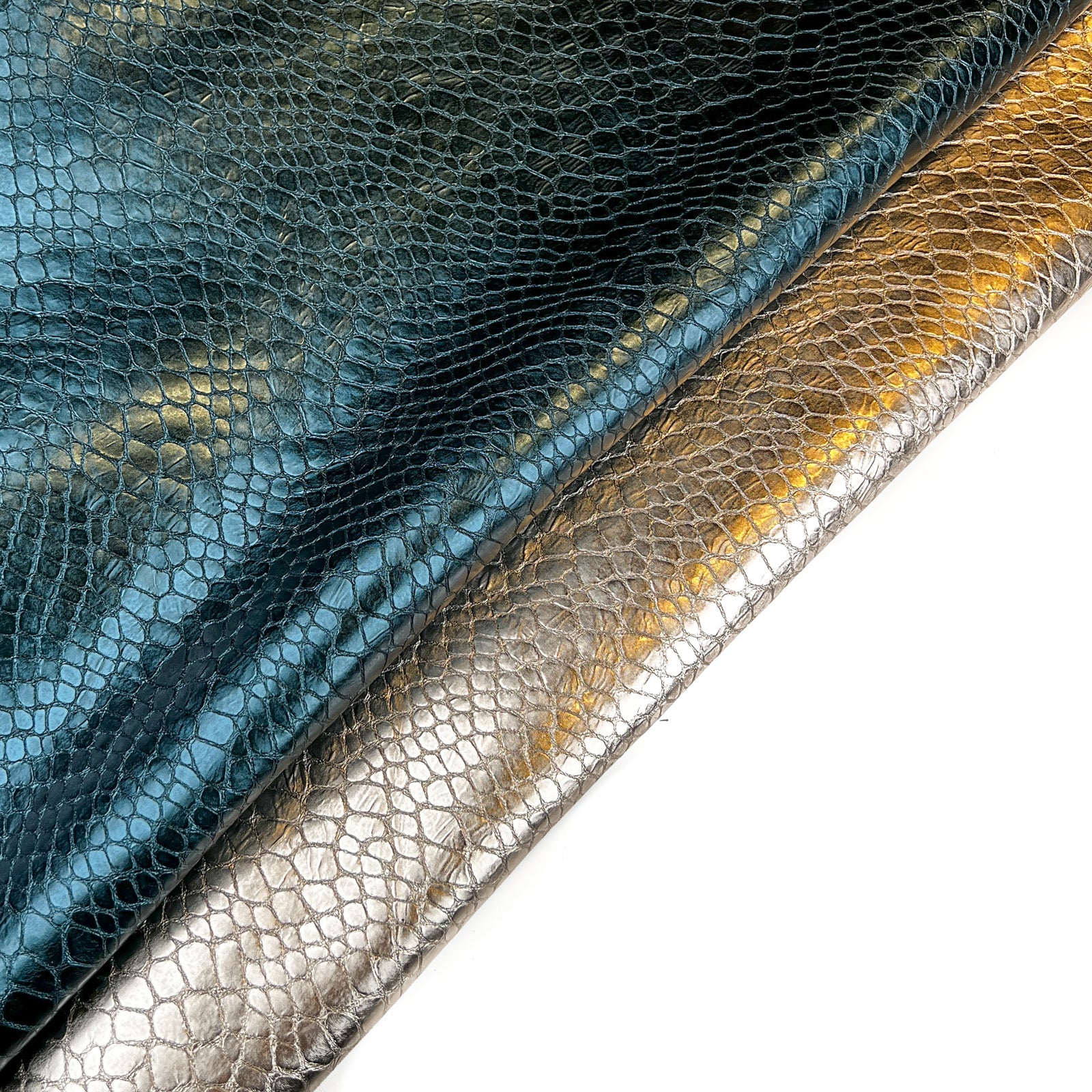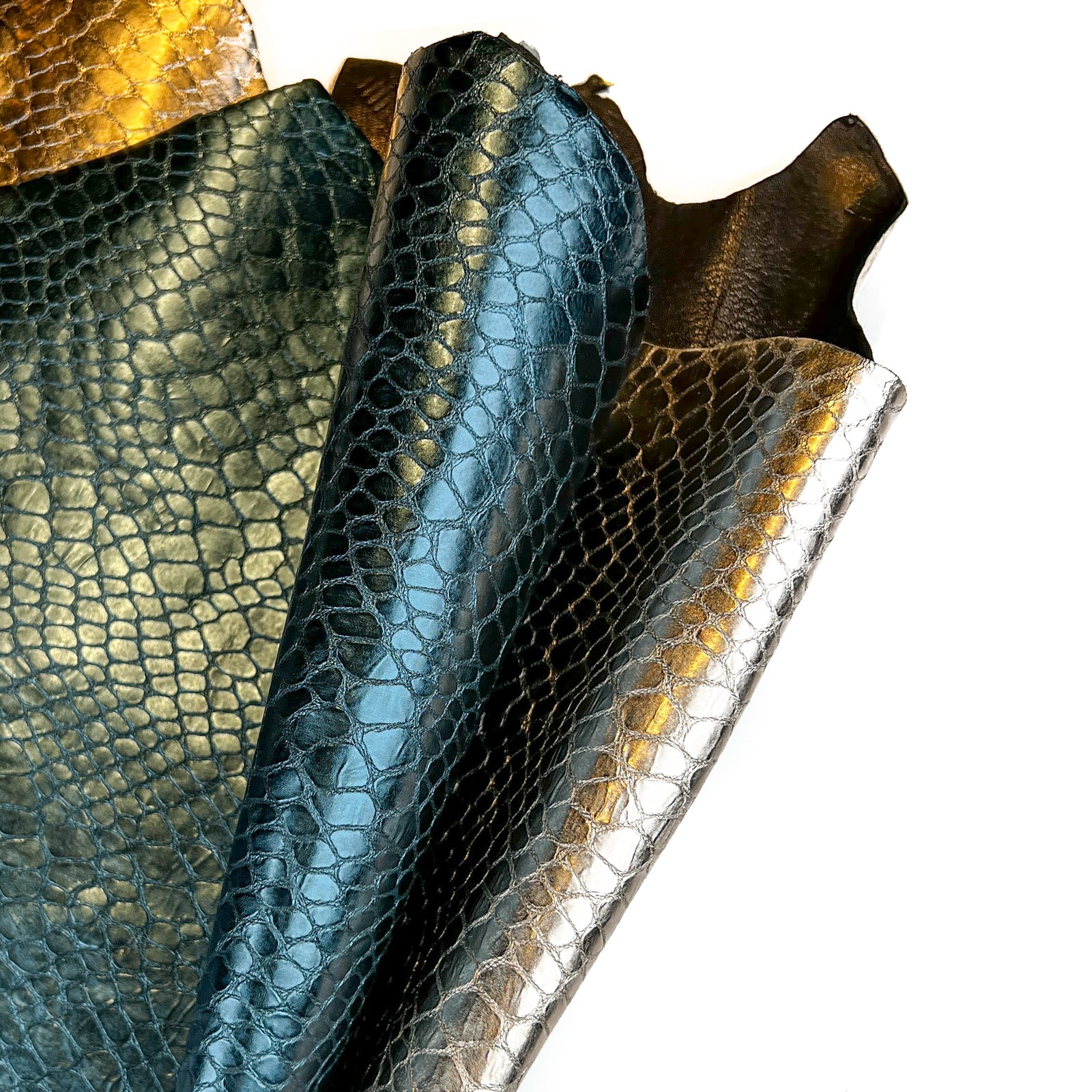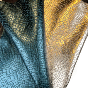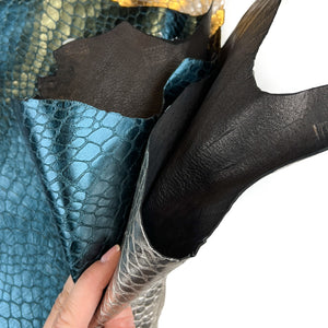 Light gold and teal blue leather hide with the same reptile print. Choose your color! Thick pieces for crafting. Amazing leather for bag and purse crafters will be long-lasting. Our mission is to provide only the highest quality Italian leather to other leather workers, crafters of all kinds, small businesses, or shops for your own projects.