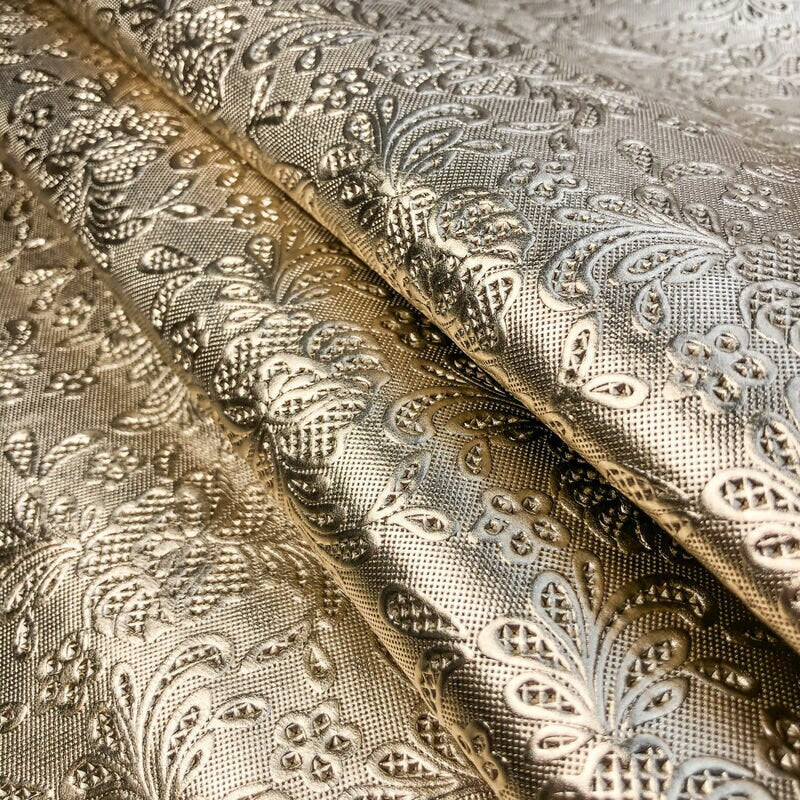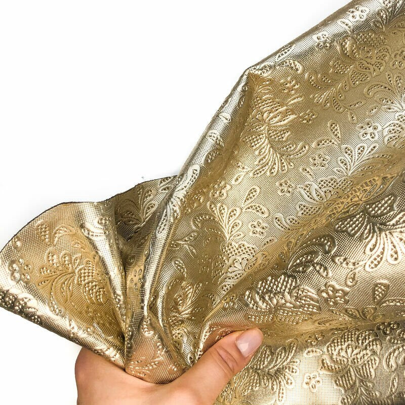 -Light gold shiny patent leather. Beautiful embossed flowers all over the light gold leather. Quite stiff and rough for sheepskin material. Will hold its shape. Jewelry supplies.