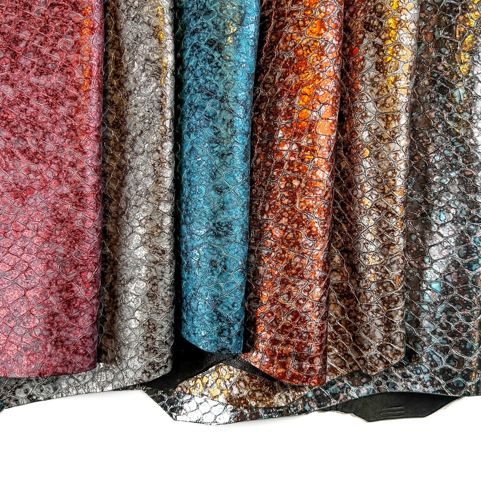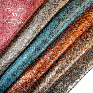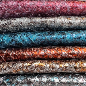 - Red, gray, blue, orange, bronze, back metallic leather with mermaid scale print. Small spots all over the hides. Leather will be perfect for all kind of diy jewelry. High quality Italian lambskin.