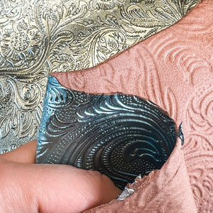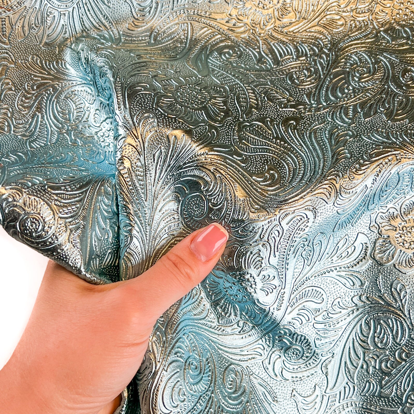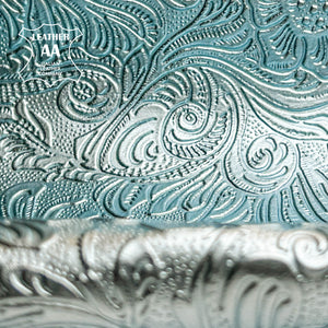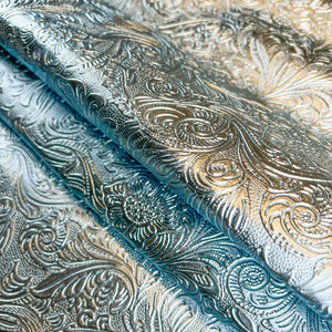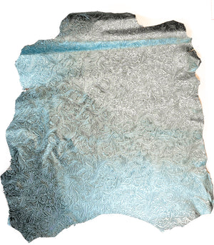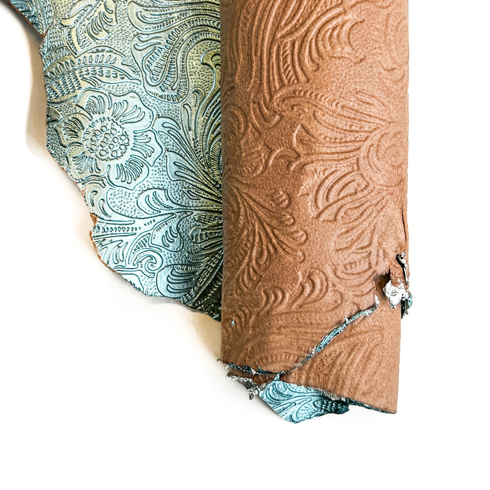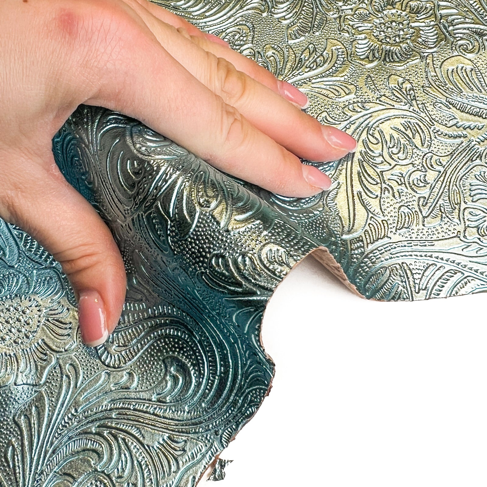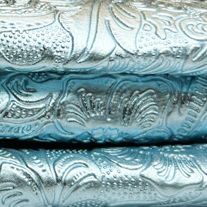 Metallic light blue lambskin leather with flower print. Shiny, thick hides with flower print embossing. Amazing leather for bag and purse crafters will be long-lasting. Our mission is to provide only the highest quality Italian leather to other leather workers, crafters of all kinds, small businesses, or shops for your projects.