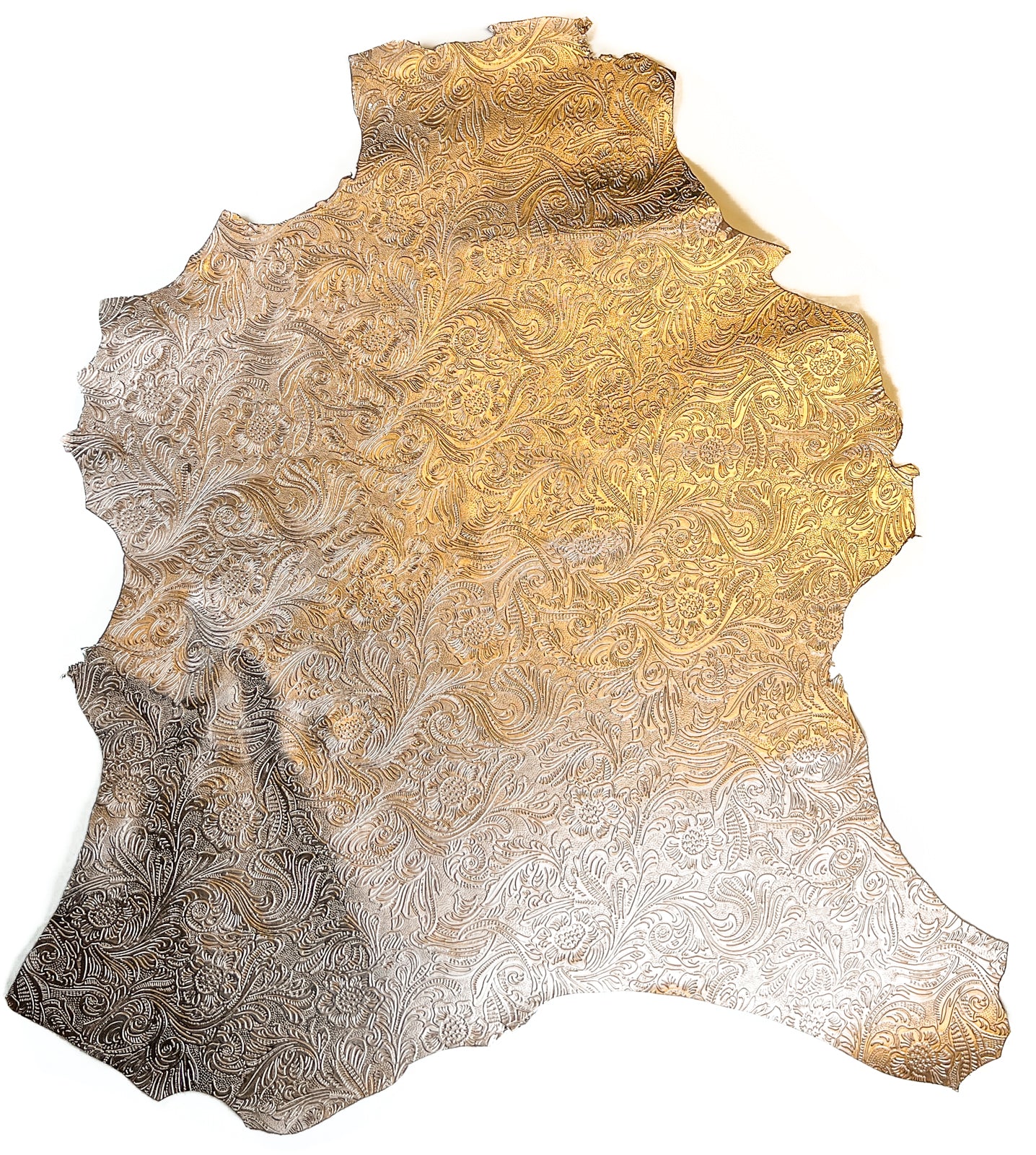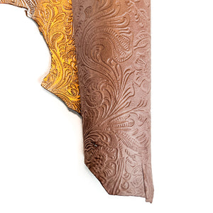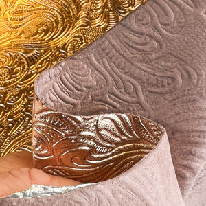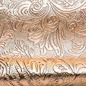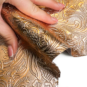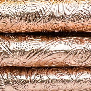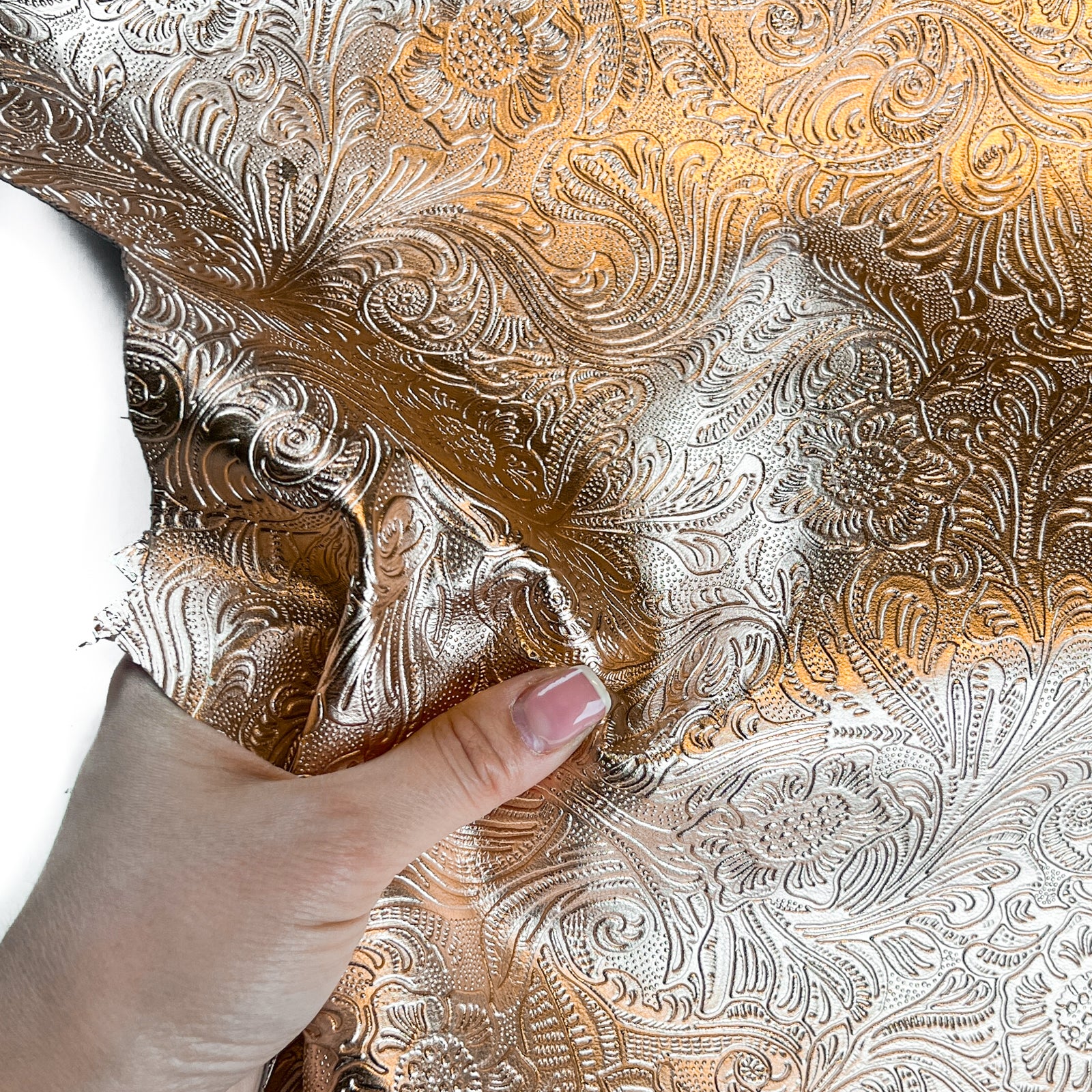 Metallic rose gold lambskin leather with flower print. Shiny, thick hides with embossing. Amazing leather for bag and purse crafters will be long-lasting. Our mission is to provide only the highest quality Italian leather to other leather workers, crafters of all kinds, small businesses, or shops for your projects.