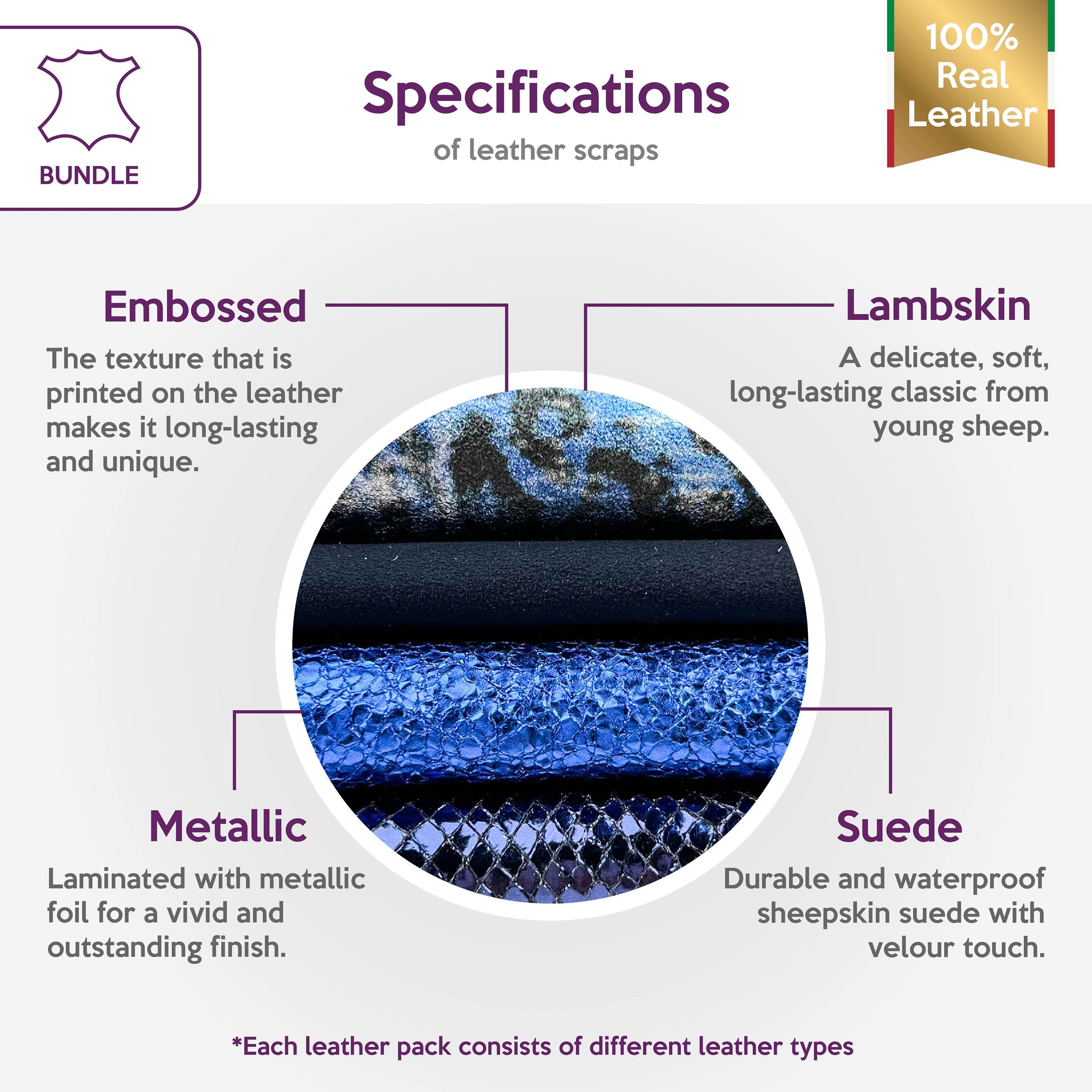 High-quality lambskin leather bundle of 4. Includes the softest sheepskin leather, beautiful metallics, and unique lizard prints.