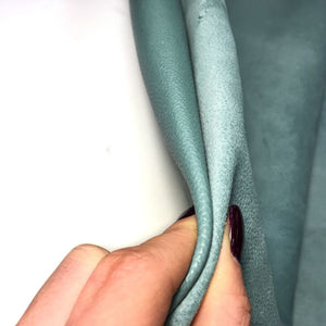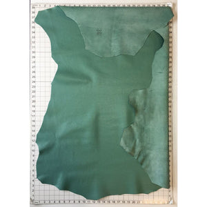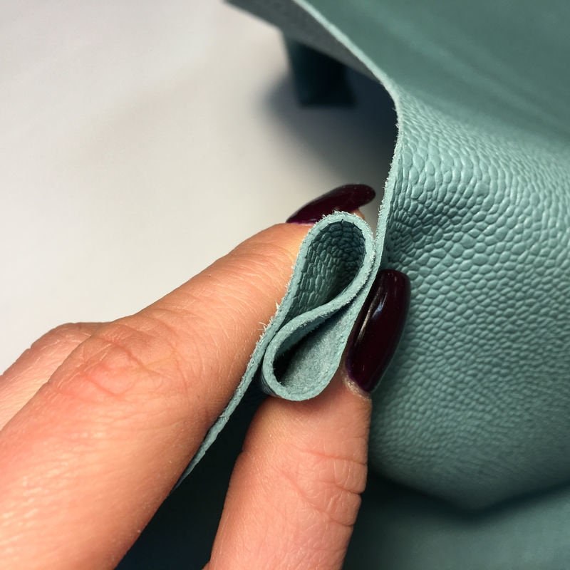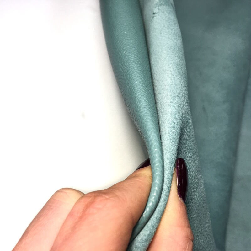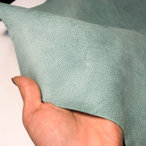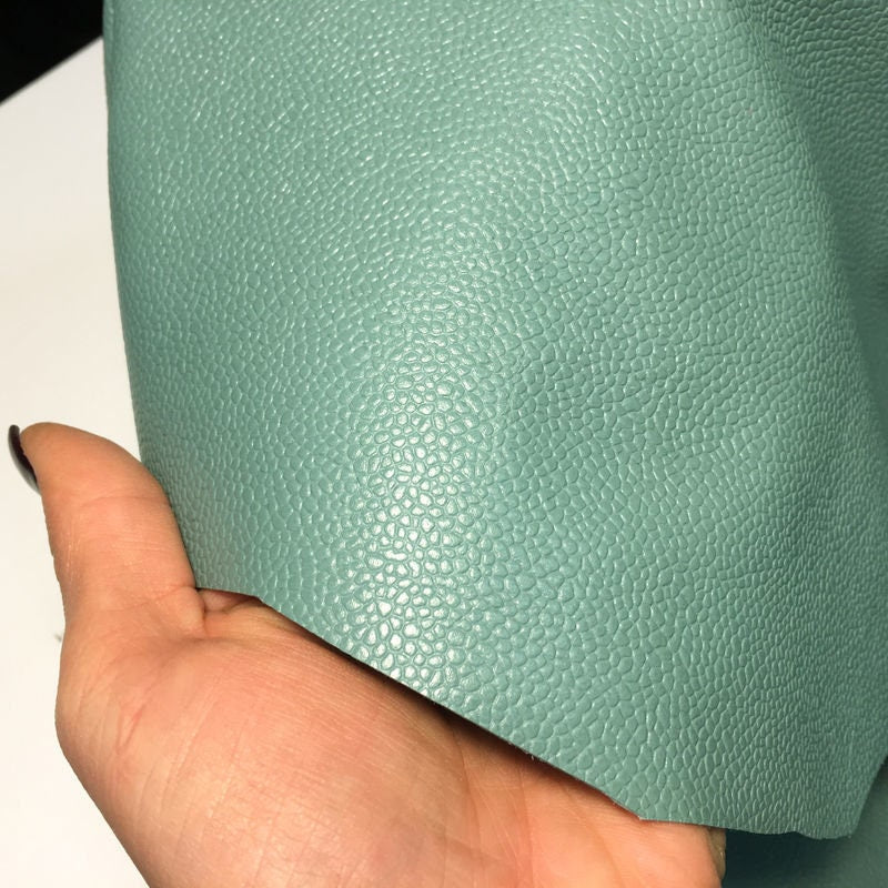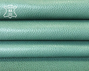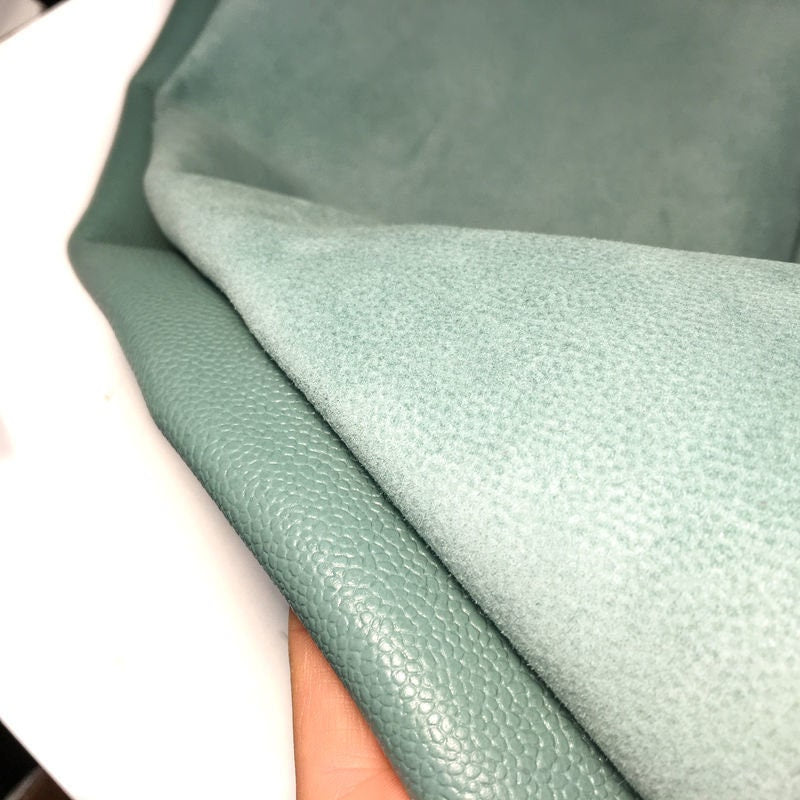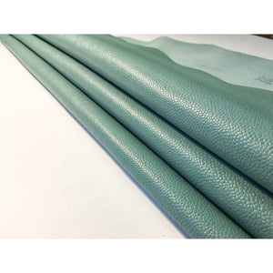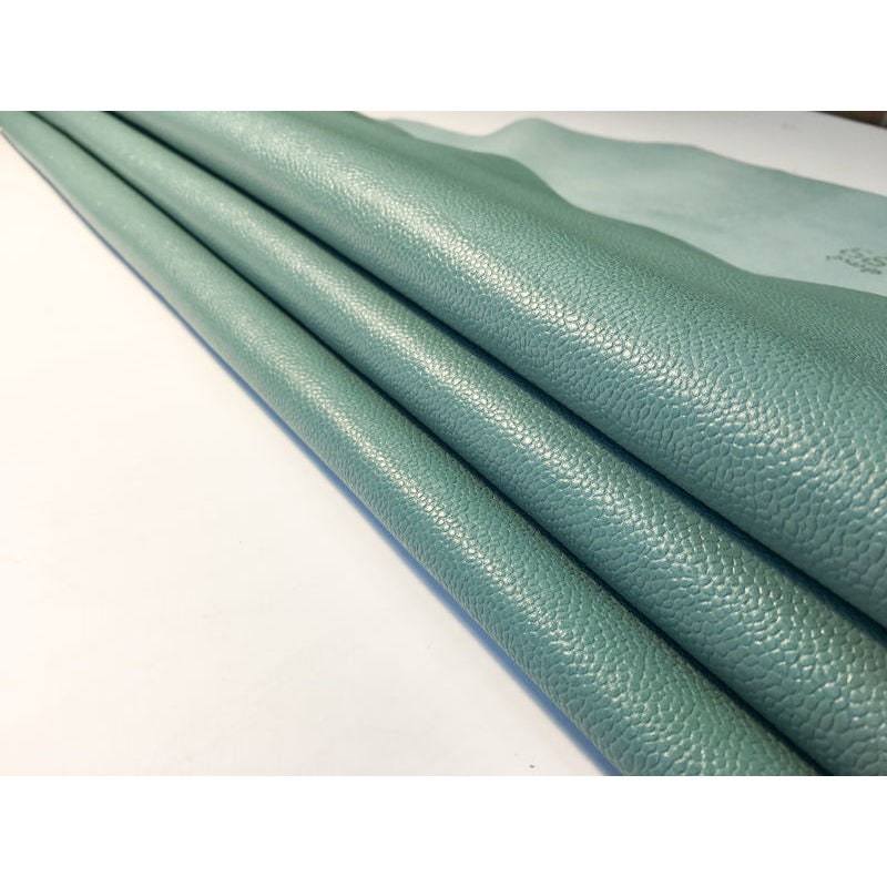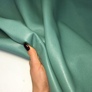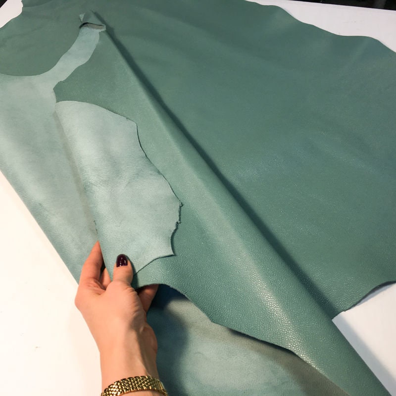 -PASTEL GREEN textured leather fabric, colored throughout, deep coloring, deep and rich color. Quite thick but soft leather skins. Sell in full hides. Firm and high quality leather pieces. Has this little water drop texture.