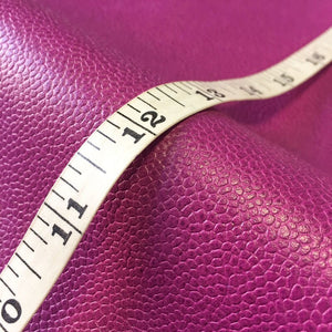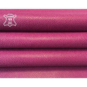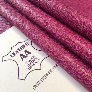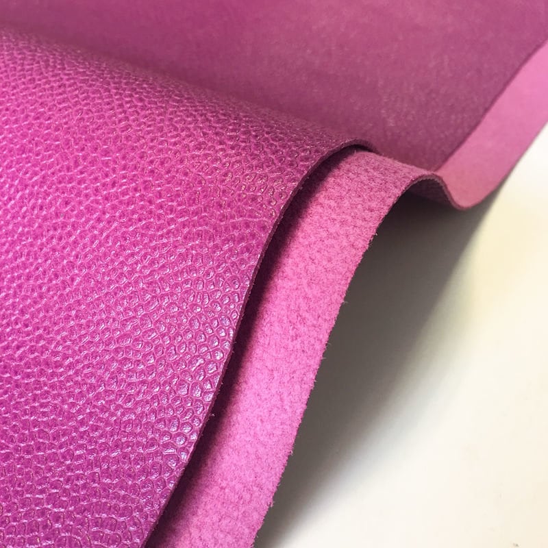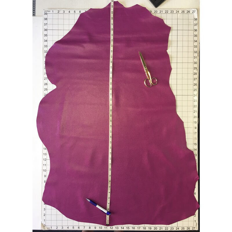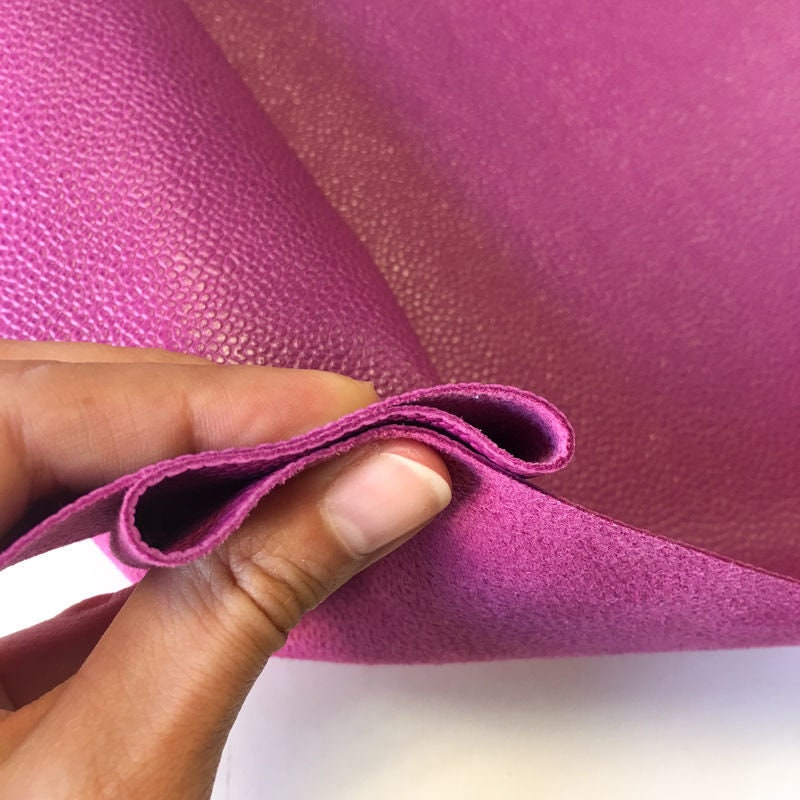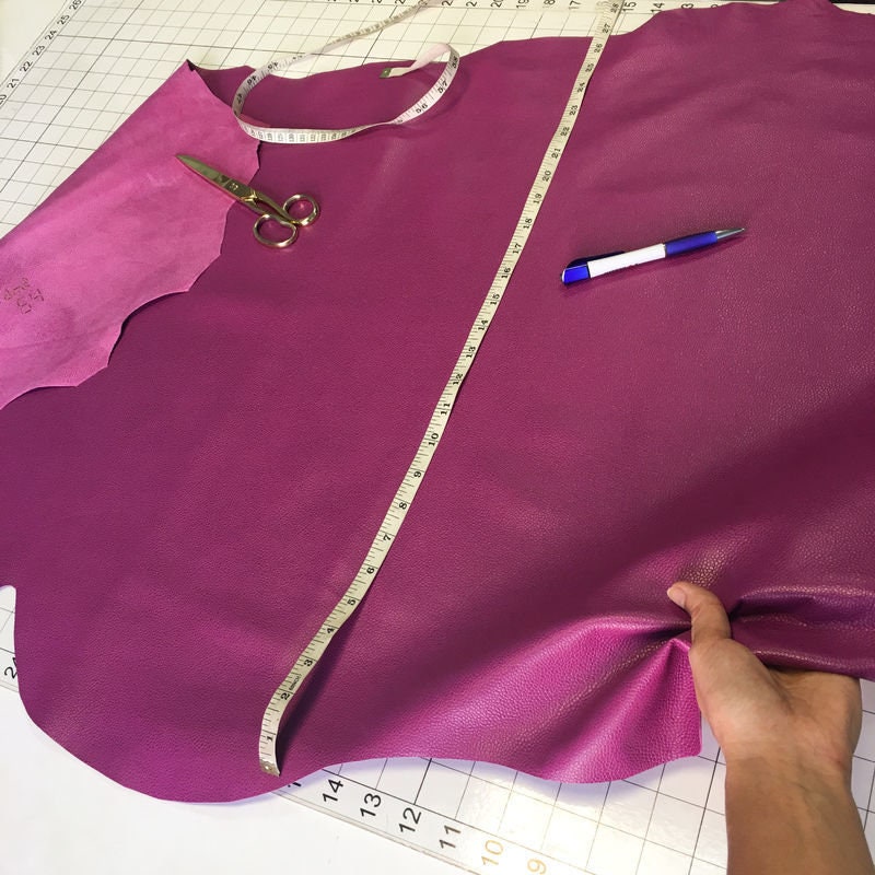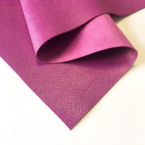 -Nice and quality medium thin leather fabric. Soft, lightweight bright violet hides, pleasant on touch, easy to work with, not too elastic. Bit shiny, pebbled finishing.