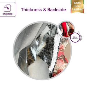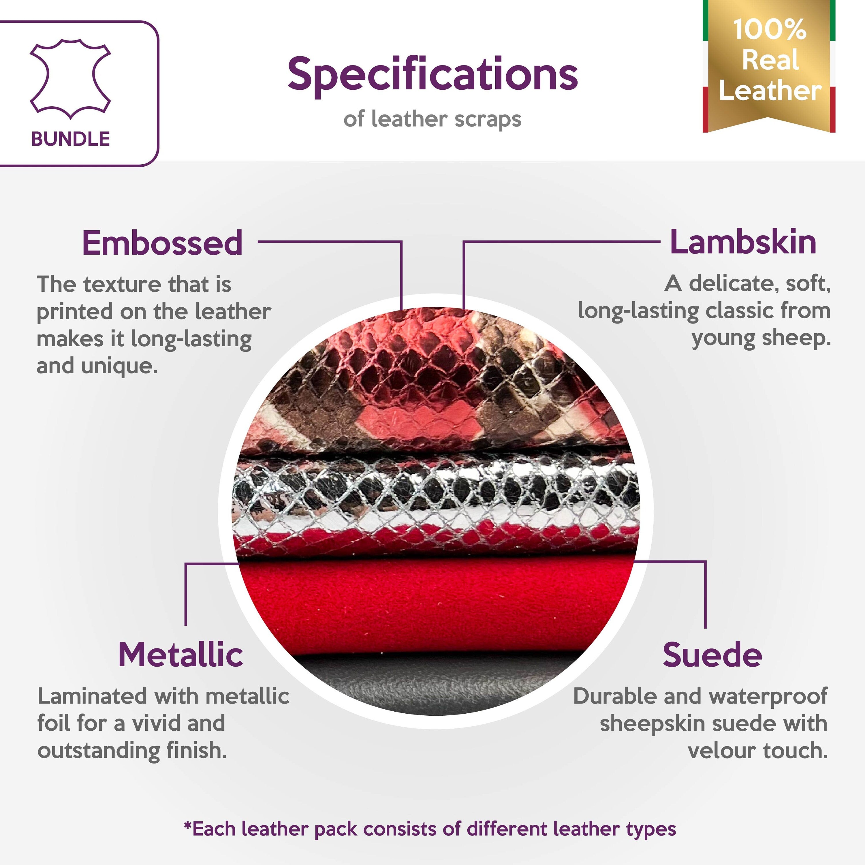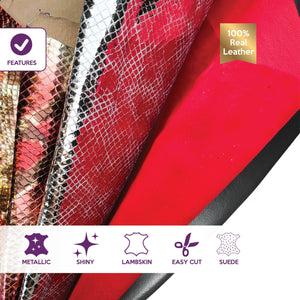 High-quality lambskin leather bundle of 4. Includes beautiful metallic red snakeskin print leather, soft red suede leather, beautiful silver metallic, and classic gray lambskin.
