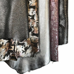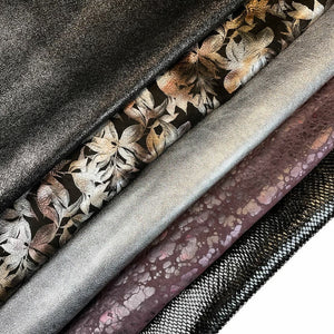 - Sparkly and shiny leather mix. Various prints that can be combined together or used individually. Soft silver lambskin, a bit stiff snake print leather, soft suede type leather - black sparkles, flower, purple spots. Choose your best match from 5 different prints. Perfect leather for bags, purses, wallets etc.