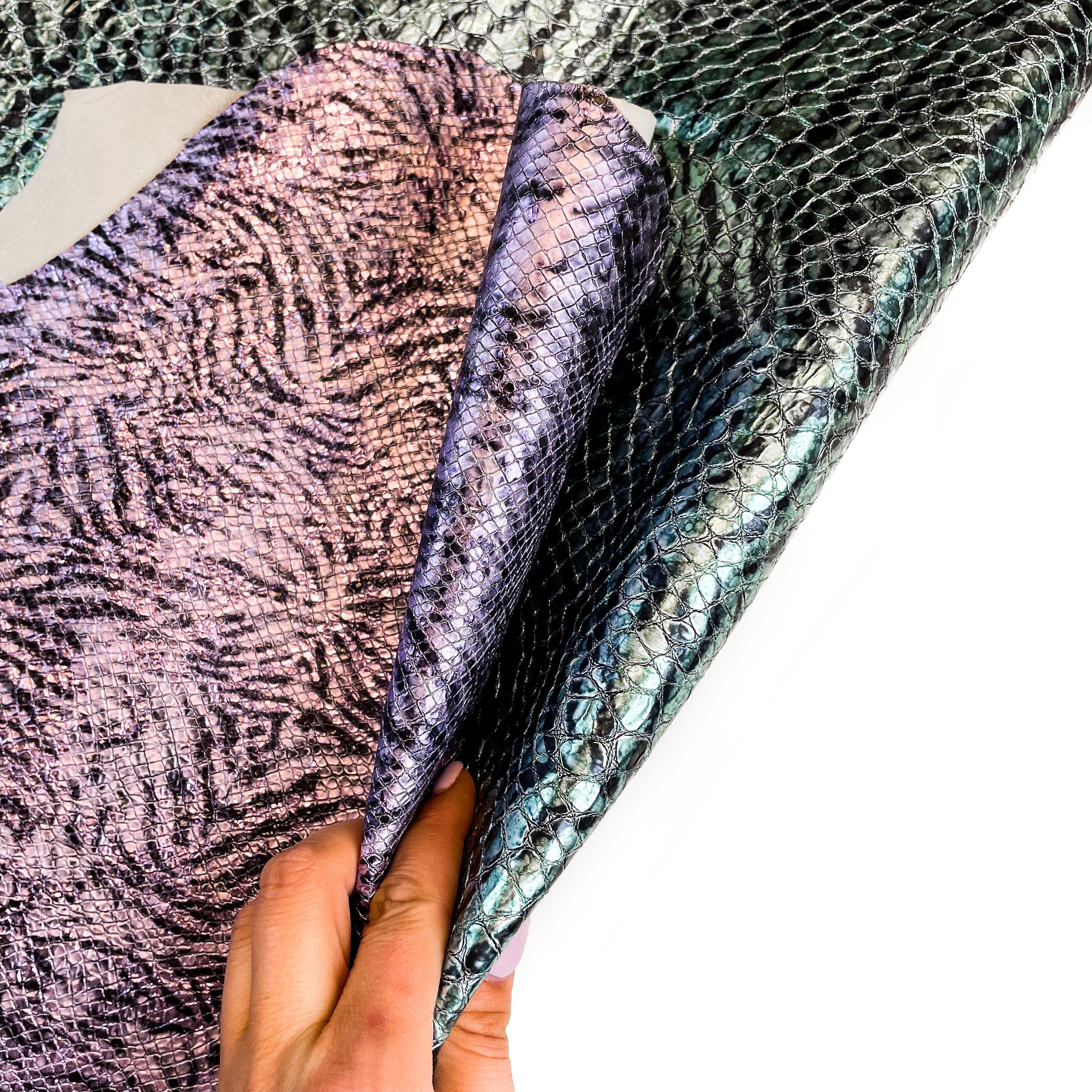 - Shiny metallic leather with zebra print. Snakeskin textured. Bit thick leather but will hold the shape.