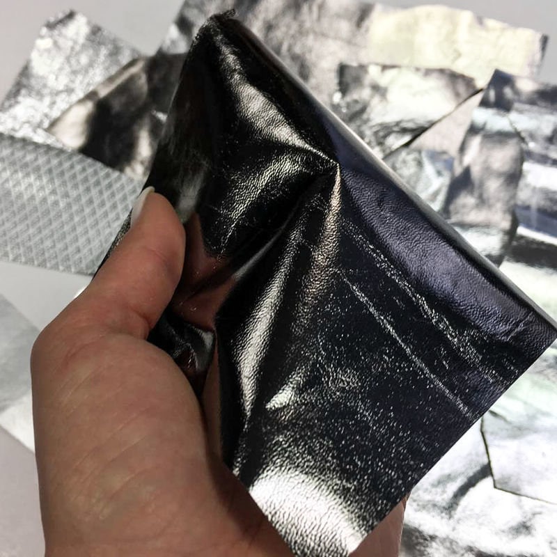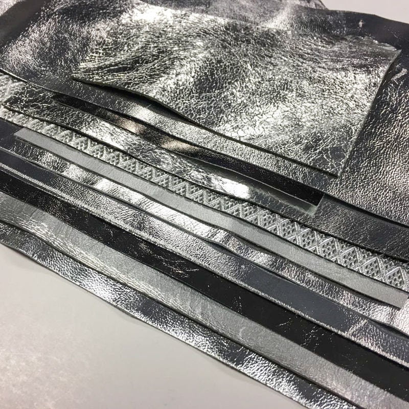 *Our Scrap packs are perfect for designers looking for leather for METALLIC SILVER leather jewelry, small leather goods, and pieces on handbags, also black leather tassels. Feel free to contact for more information.