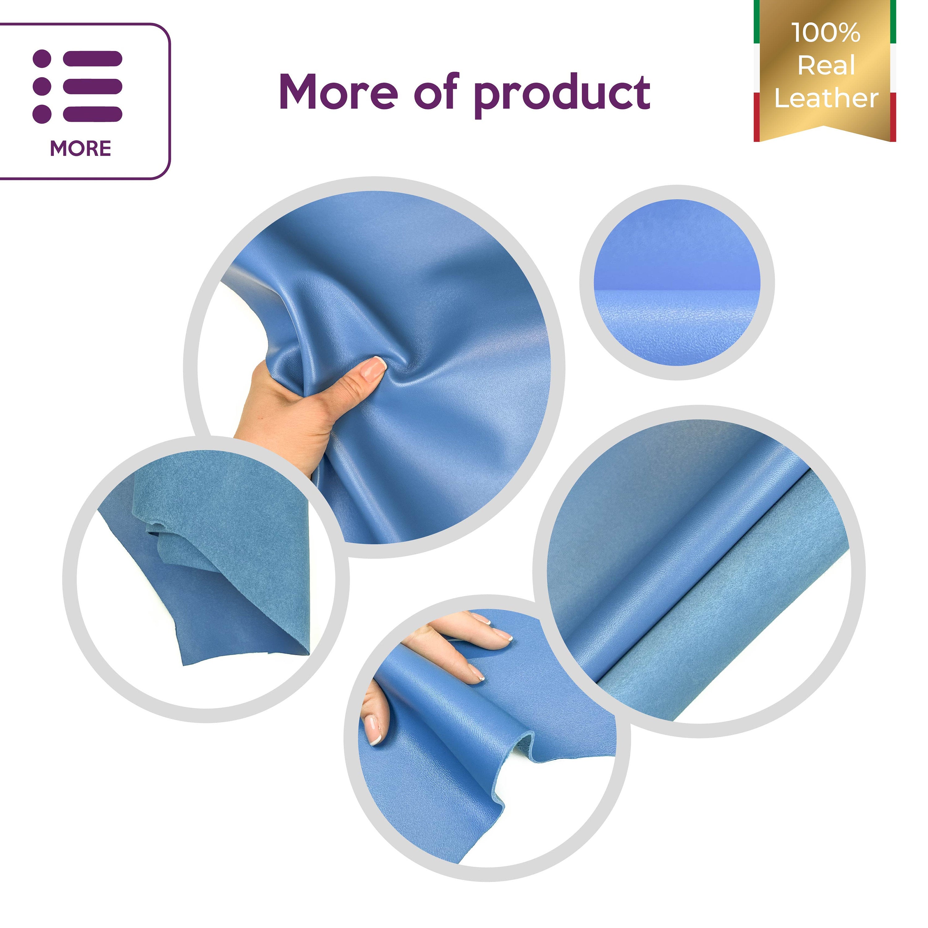 - Beautiful classic sky blue lambskin leather. Leather is thick and will perfectly hold its form. The backside is light blue.