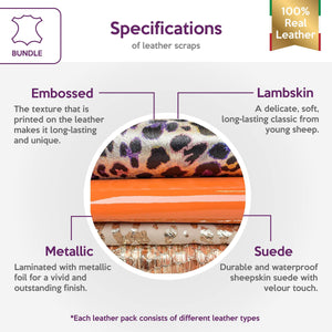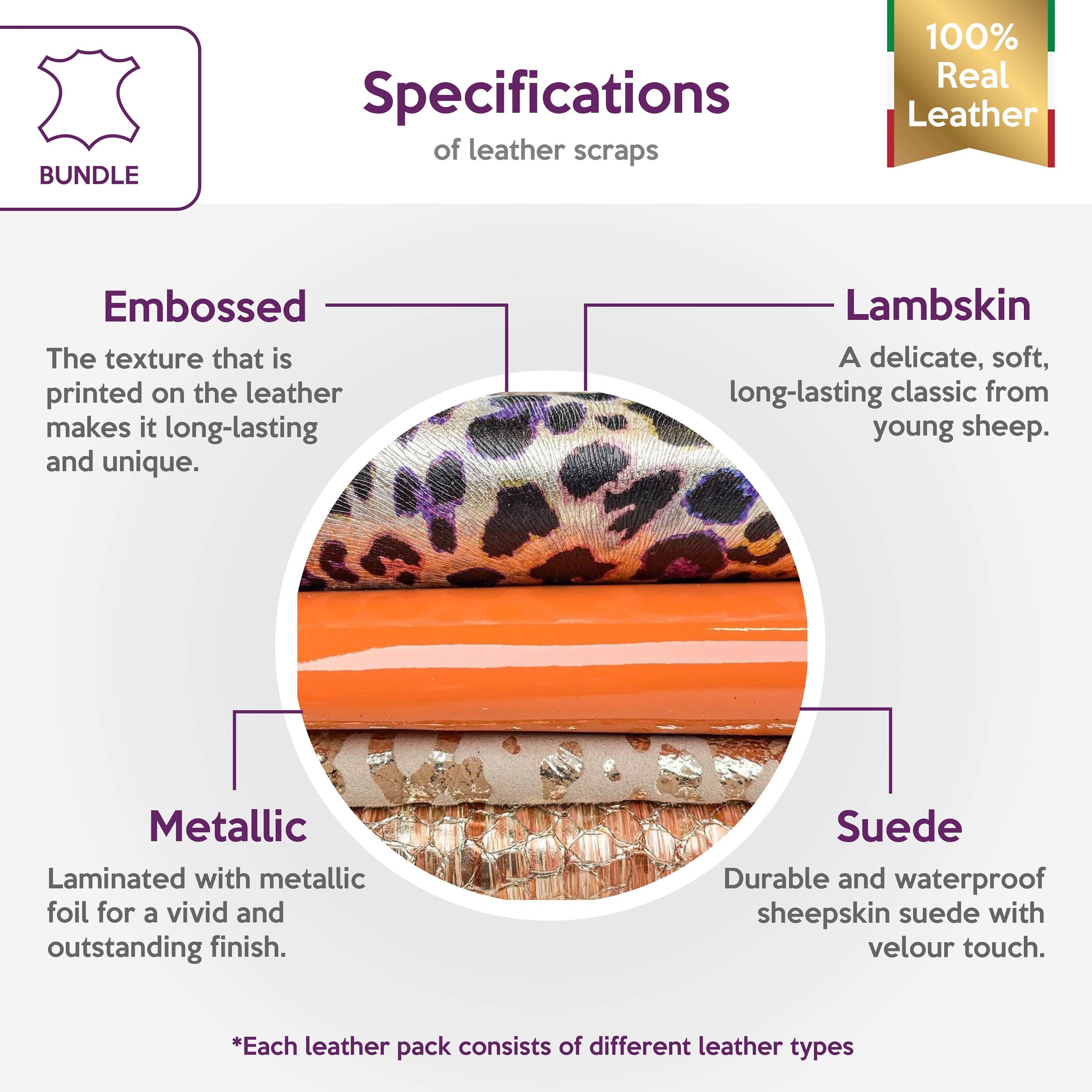 High-quality lambskin leather bundle of 4. Includes the softest sheepskin leather, beautiful metallics, and unique embossing.