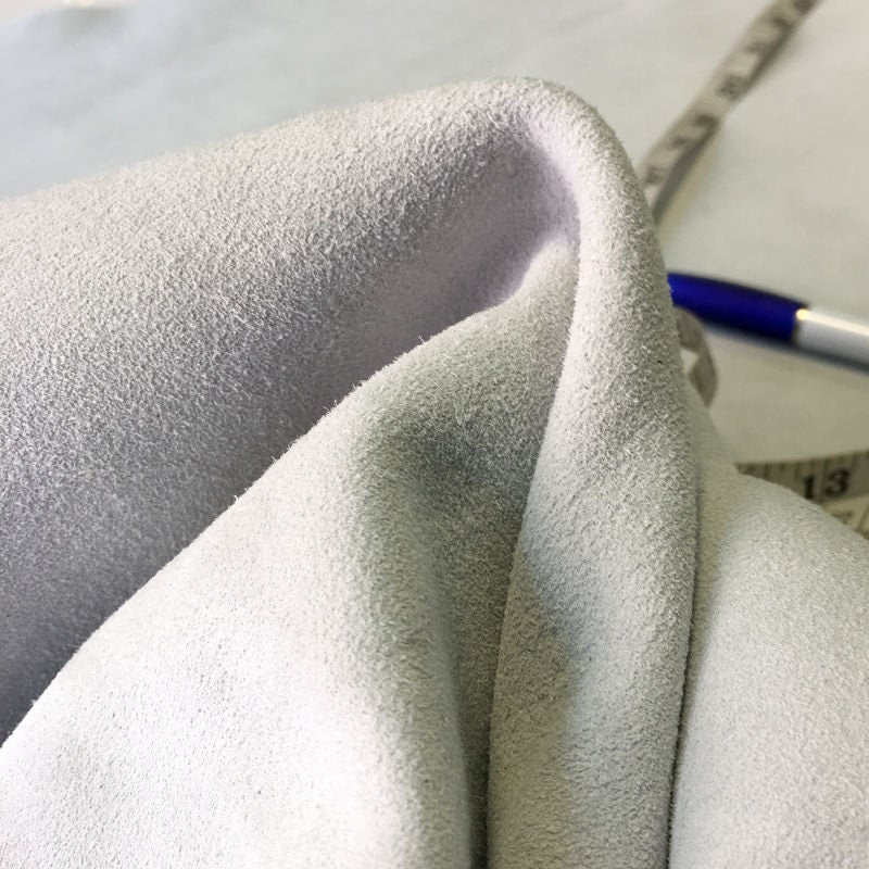 THICK LIGHT GRAY SUEDE FABRIC Genuine off white sheep suede leather. Barely blue, smokey color, A grade quality suede made in Italian best tanneries. Thick but soft suede, semi-pliable, clean, large...