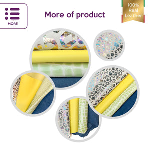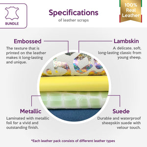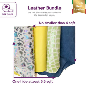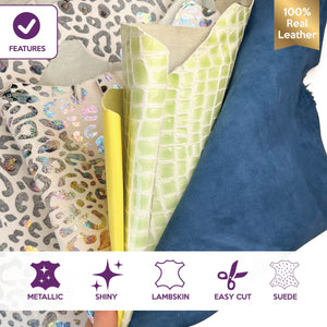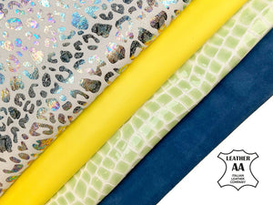 High-quality lambskin leather bundle of 4. Includes the softest yellow sheepskin leather, beautiful green crocodile leather print, blue suede, and very unique metallic gasoline leopard.
