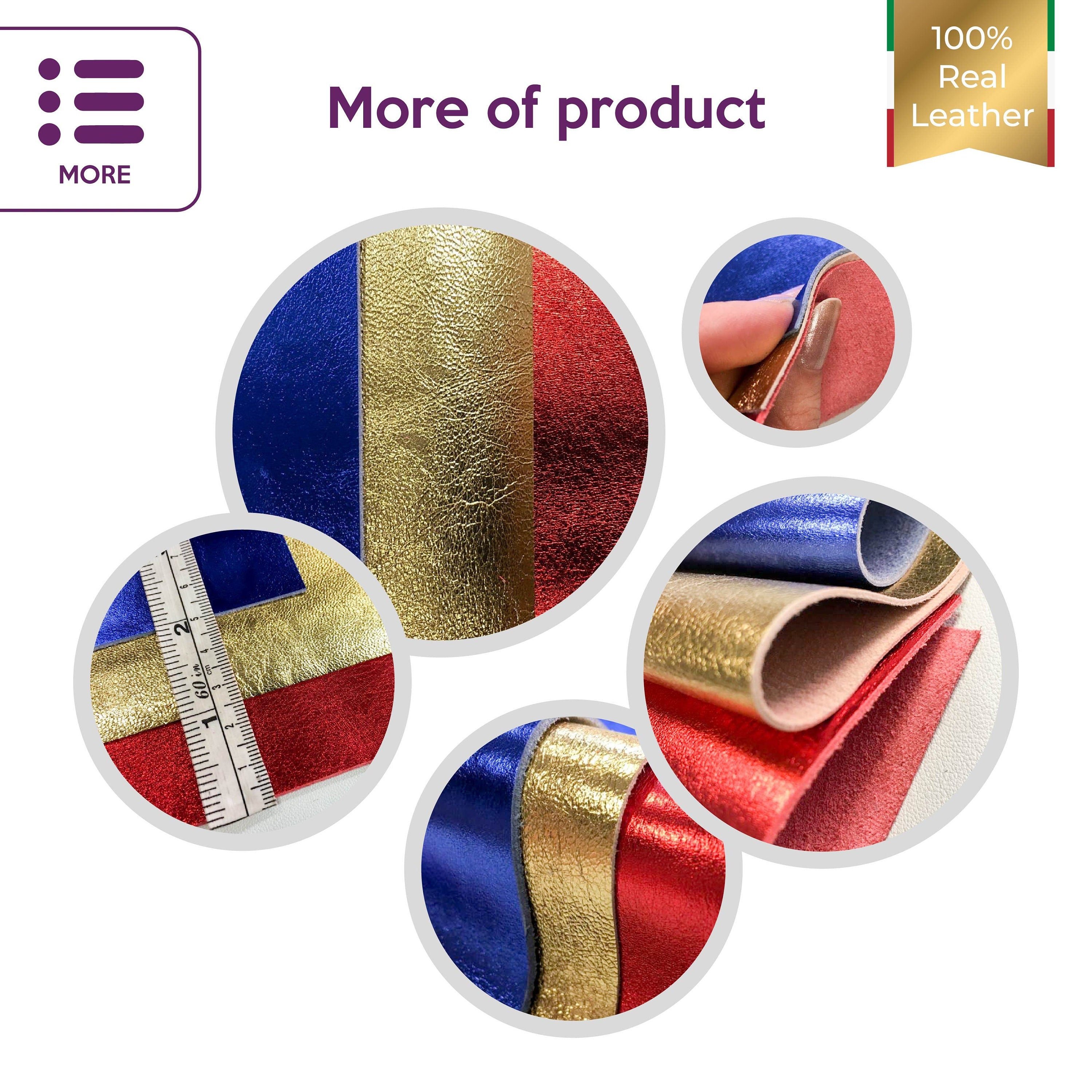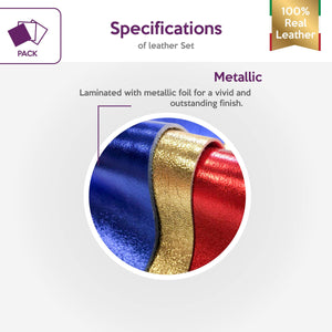 High quality Italian made leather in size 5x5 in x 10 in (12.5x12.5 cm and 25x25 cm). 3 bright metallic leather sheets for crafts, jewelry and other great projects!