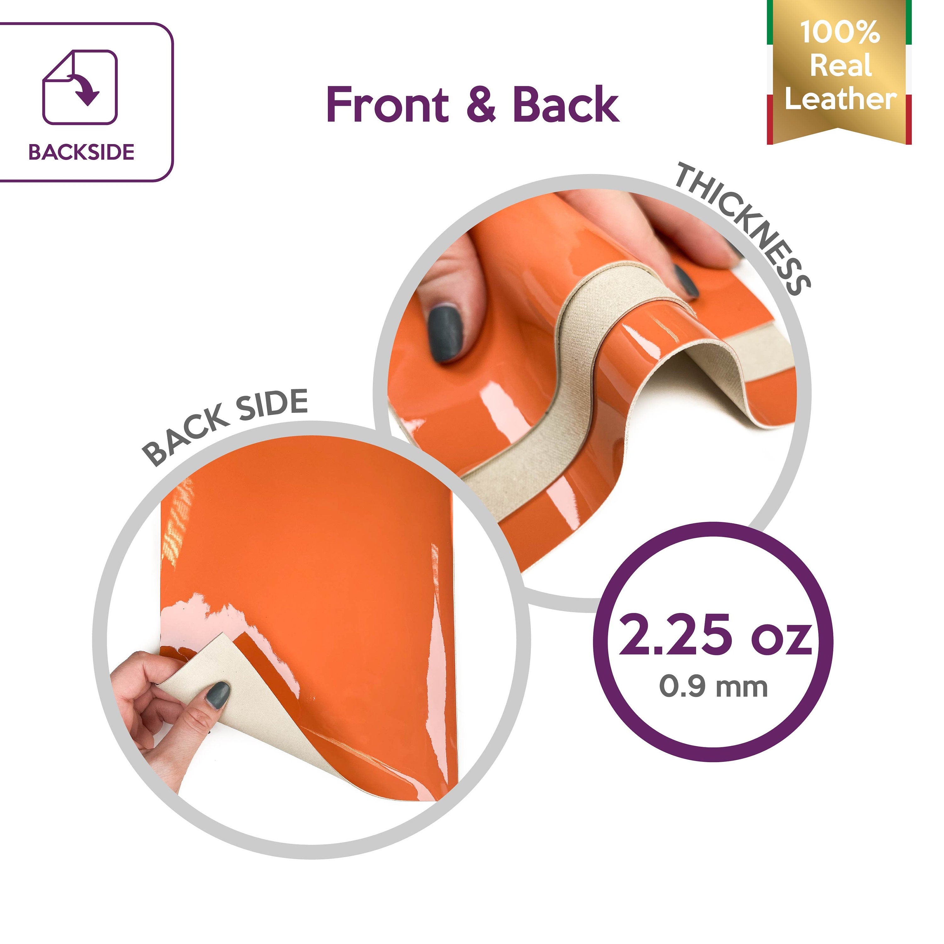 - Bright orange leather sheets. Shiny patent leather. Thick leather sheets with light gloss all over it. Perfect for sewing, bright earrings and other cool projects. Great material for varios leather projects. Backside is clean, grained.