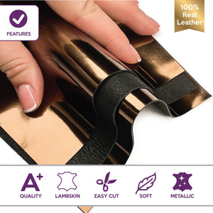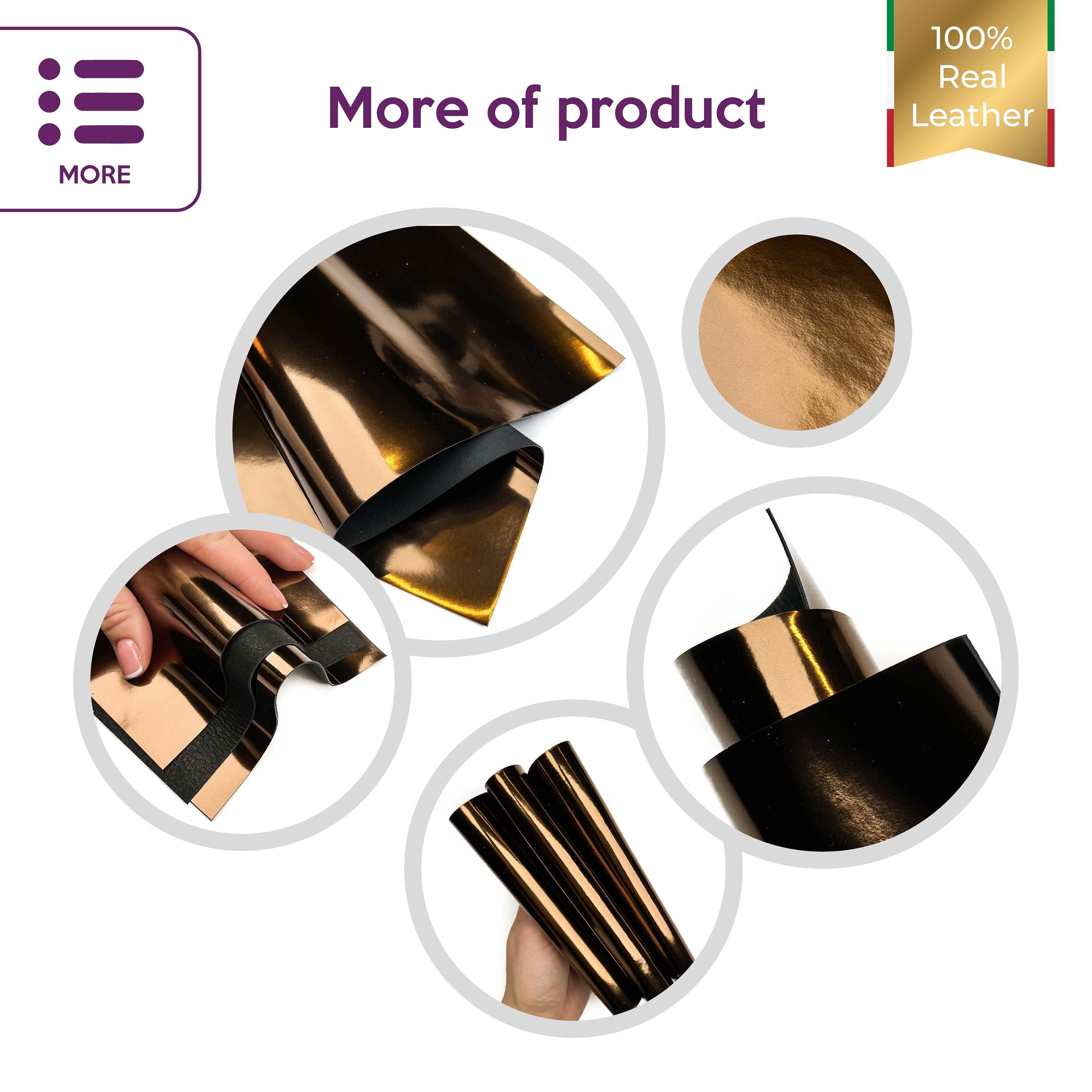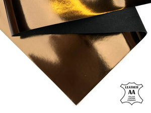 - Shiny metallic bronze leather sheets with black backside. Natural lambskin mirror pieces from the best Italian tannery. Perfect leather for sewing.