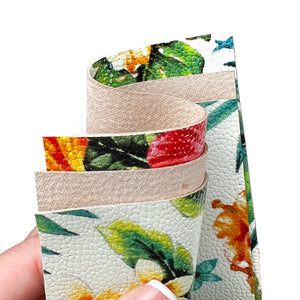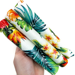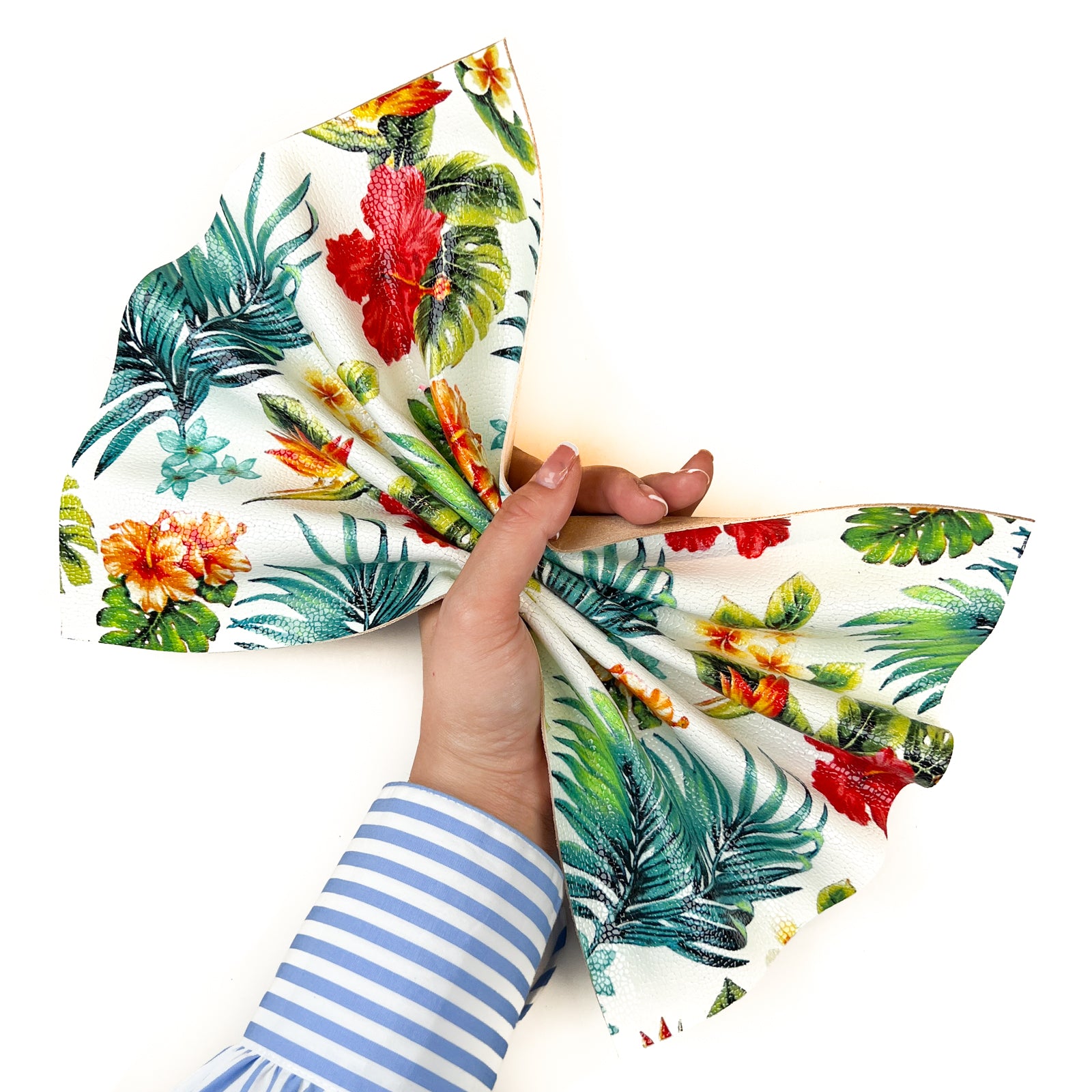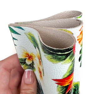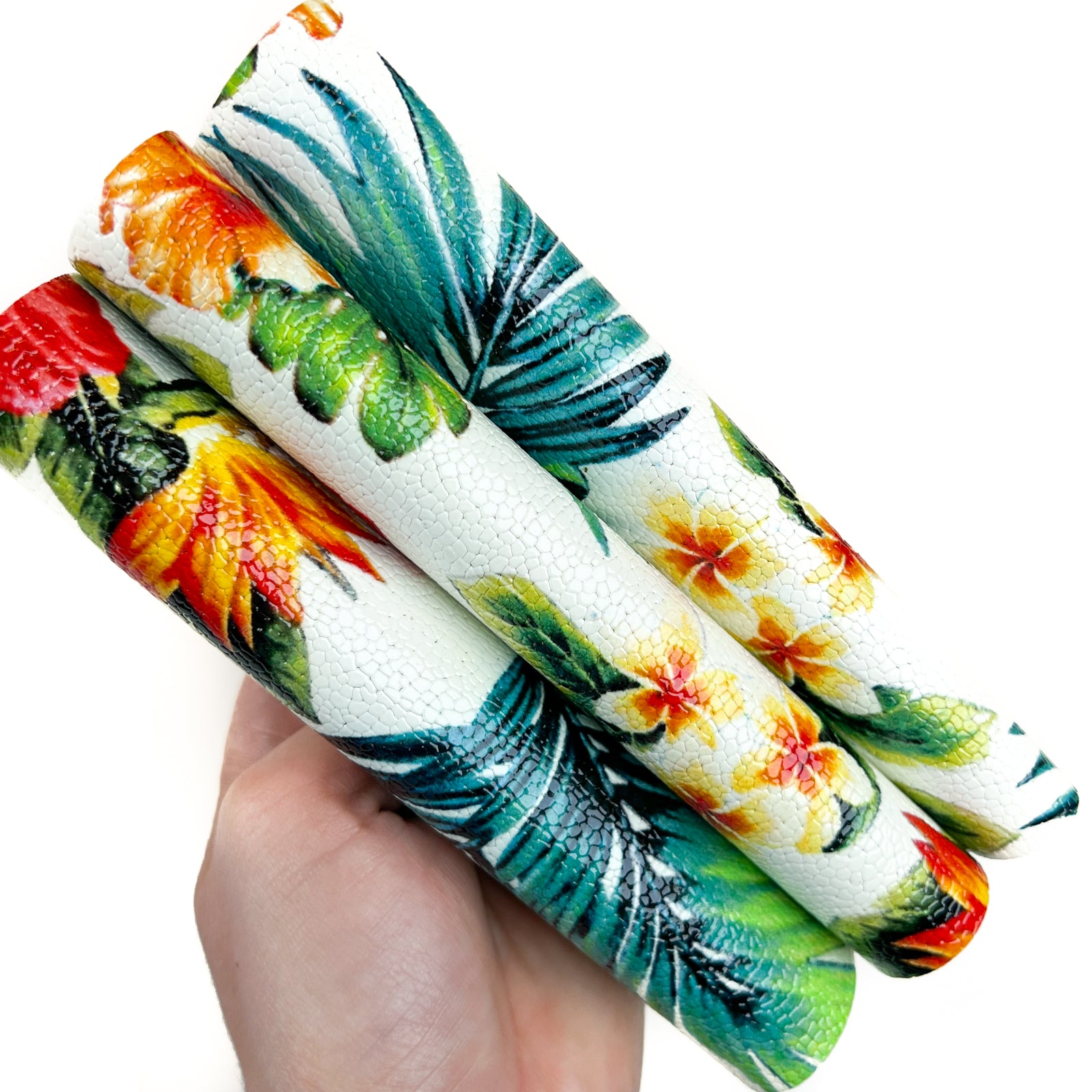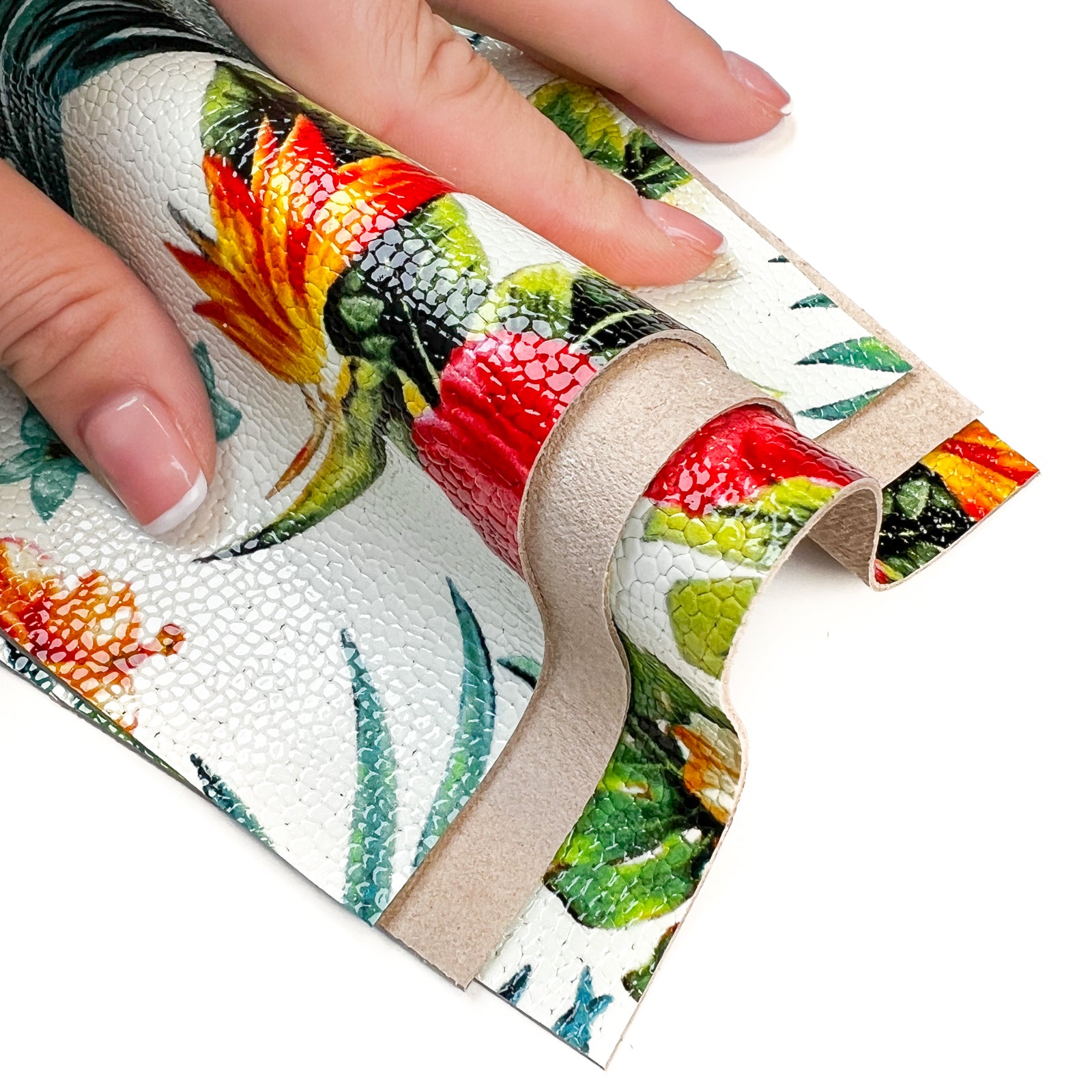 Beautiful white calf leather sheets with a unique Hawaii type of print that includes flowers and leaves. The leather fabric has a textured finish. Amazing leather for bag and purse crafters will be long-lasting. Our mission is to provide only the highest quality Italian leather to other leather workers, crafters of all kinds, small businesses, or shops for your own projects.