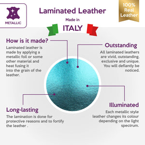 High-quality lambskin leather sheets in shiny metallic blue color. Metallic mirror leather pieces for your best projects! Our mission is to provide only the best quality Italian leather to other leather...