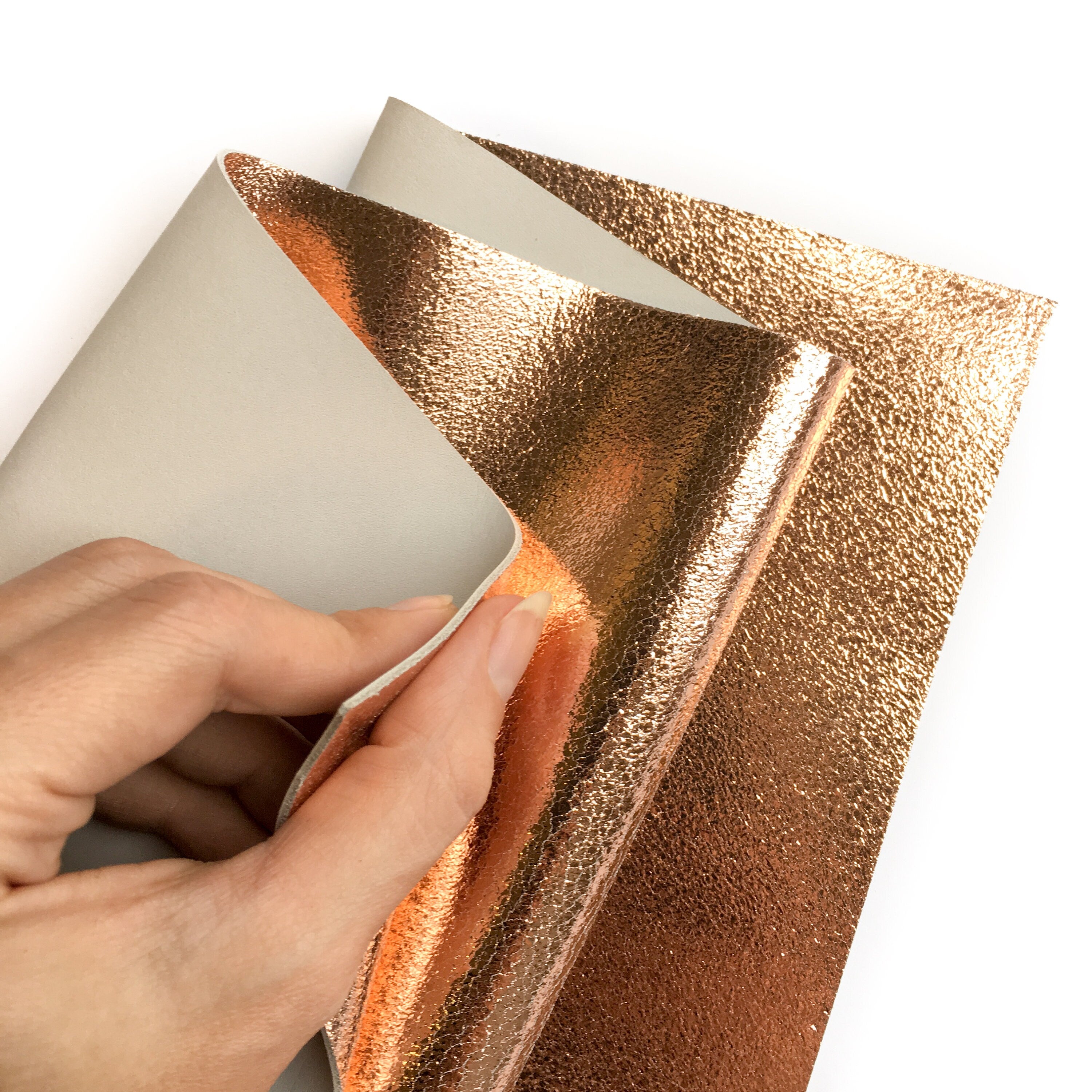 NEW ROSE GOLD SHEEP SKIN SHEETS 2.5 oz Supple and glossy rose gold metallic leather sheets with tiny crackle texture. Clean, light gray backside - with visible grain. Can be used as double faced. Real, Italian made lambskin with bit crunchy rose gold print. "NEW ROSE GOLD" Name: NEW ROSE Gold Leather Code: 585(Salmone130)1.0 Colour: Rose Gold / natural light brown backside Thickness: 0.8-1.0 mm / 2-2.5 oz Sold per piece - 1 sheet We offer other *SHEETS* at sizes: 6x6 inches (or 15x15 cm) 8x10 inches (20x25 cm almost A4 size) 12x12 inches (25x25 cm) 12x18 inches (30x45 cm or bit larger than A3 size) 18x24 inches (45x60 cm, bit larger than A2 sheet) Whole Mirror ROSE GOLD *HIDES* available here: https://www.etsy.com/listing/584905055 *MATERIAL* ROSE GOLD leather is high quality Italian lambskin. It's perfect for cricut, sewing, earrings and other beautiful leather designs! -Please note that genuine leather is natural and part of an animal, scars and imperfections are all part of its character and personality. As every animal is different there aren't too identical pieces of leather in the world. *COLOR* -We do our best to match color and lightning of each skin, please be aware they might not correspond exactly to the ones in the pictures due to the many factors that can distort it (light, display, camera). We use Pantone TPG guide to determine exact color. *SHIPPING & HANDLING* Skins are packed carefully to avoid crumbling. We ship within 1-3 days after receiving your order. STANDARD International Delivery from Europe: *to Europe - approx. 7 - 21 days. *outside Europe - approx. 10 - 30 days (including USA) EXPRESS DELIVERY (Please send us your PHONE number in DM or add a NOTE at checkout): *Choose Shipping Upgrade *Delivered in 2 - 5 days. >>>Express delivery INCLUDED buying 4 or more hides<<< Thank YOU for doing business with Leather AA shop and loving quality Italian leather!