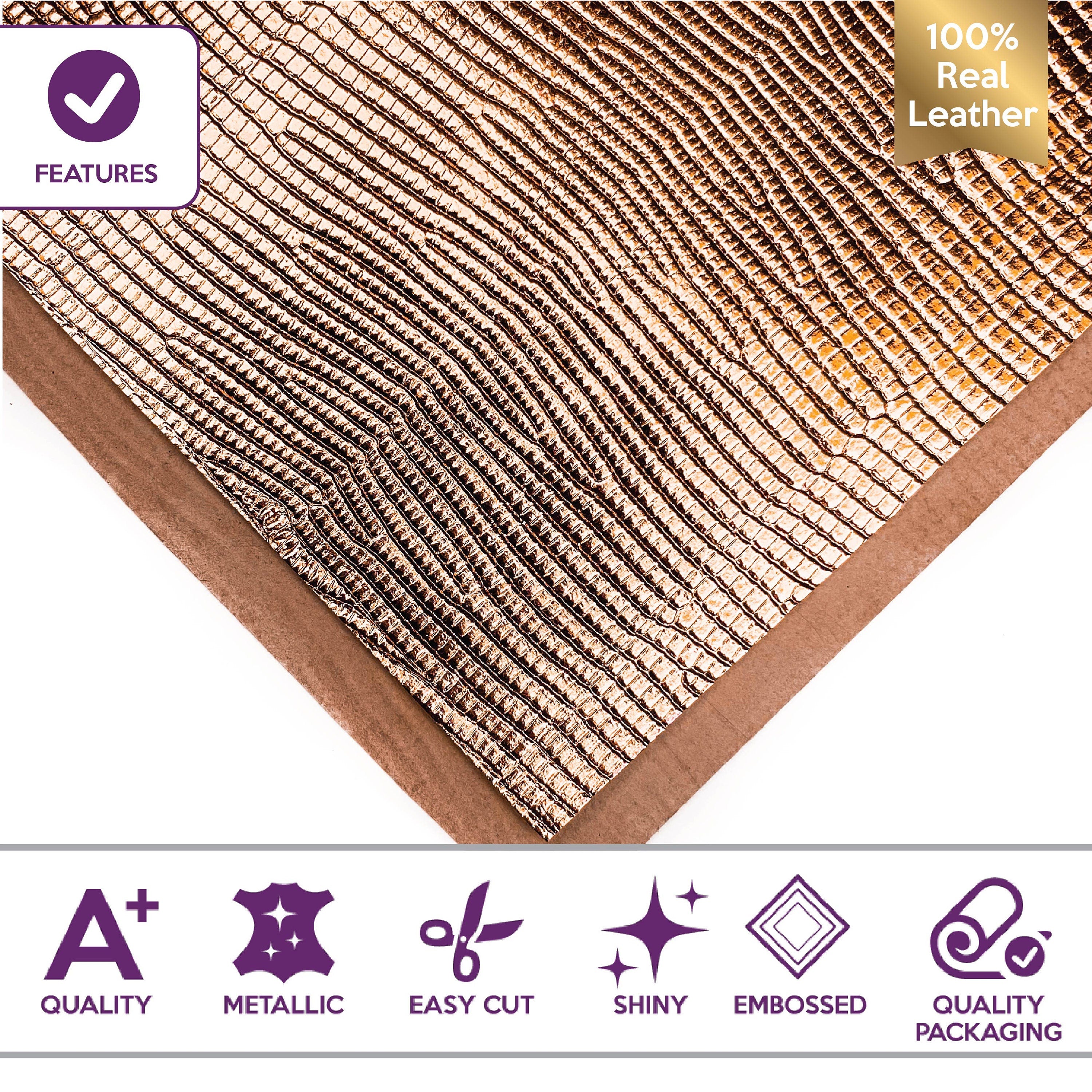 - Metallic Rose gold leather pieces (size) with texture. Leather scraps are quite thick and will definitely hold the form. Sheets are shiny polished. Calf leather. Leather will be perfect for all kind of DIY jewelry. High quality Italian calf.