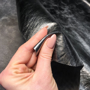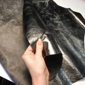 -Grundy style leather sheets, Dark silver leather pieces for sewing and handcrafting. Vintage style metallic leather print. Papery but not thin. Medium thick leather sheets. Try it!