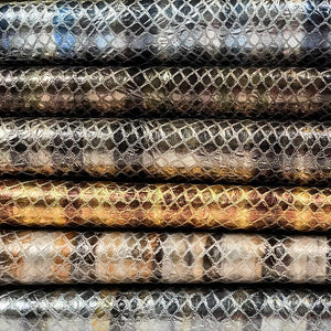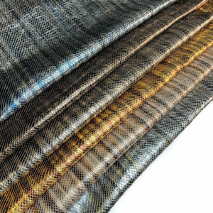 Snakeskin print leather pieces with various metallic color stripes. Textured leather for your best projects! Our mission is to provide only the best quality Italian leather to other leather workers, crafters of all kinds, small businesses, or Etsy shop for your own projects.