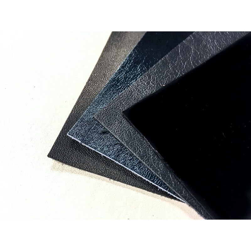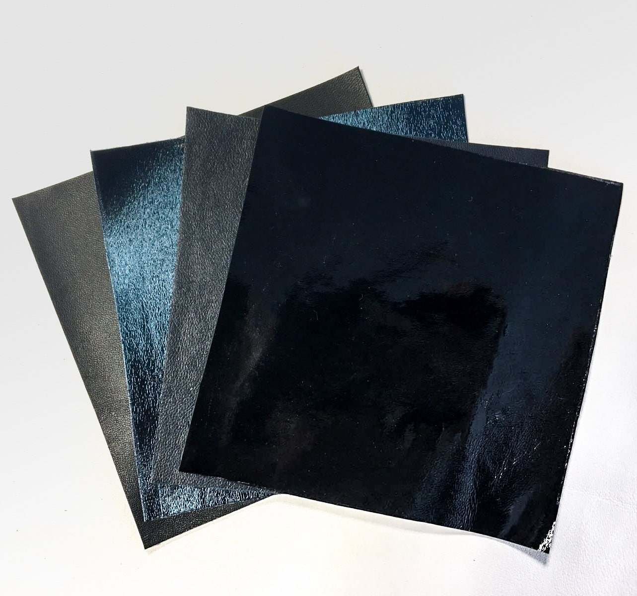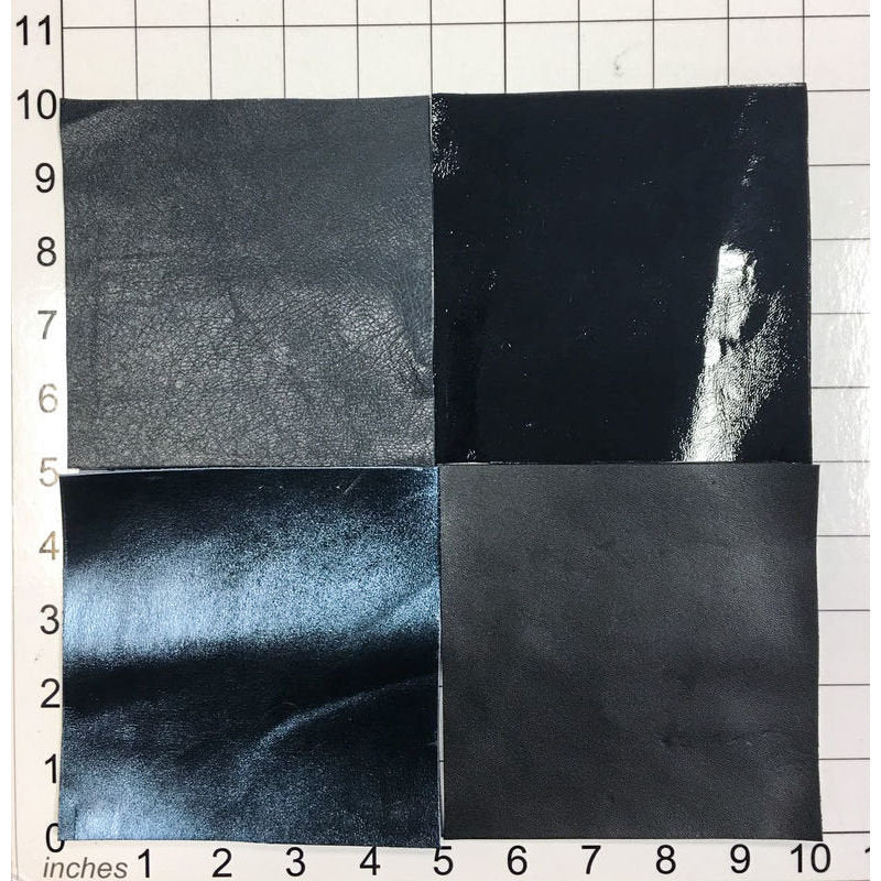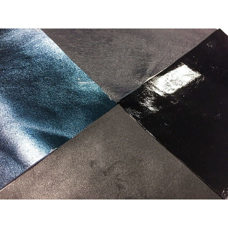 Colors: Dark Blue lambskin leather piece, Teal metallic leather print, Black lambskin leather sheet, Black lacquer patent leather