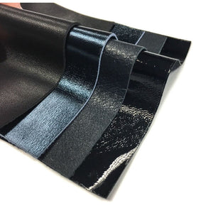 BLACK AND BLUE Leather Sheet Mix of real Sheep Skin Hides. Colors in pack: Dark Blue lambskin leather piece, Teal metallic leather print, Black lambskin leather sheet, Black lacquer patent leather. Natural Italian Lambskin leather. Receive Pack of 4 sheepskin sheets with FREE Shipping worldwide included. Size 5x5 inches (12.5x12.5 cm). Great mix of Blue andBlack leather for crafts.