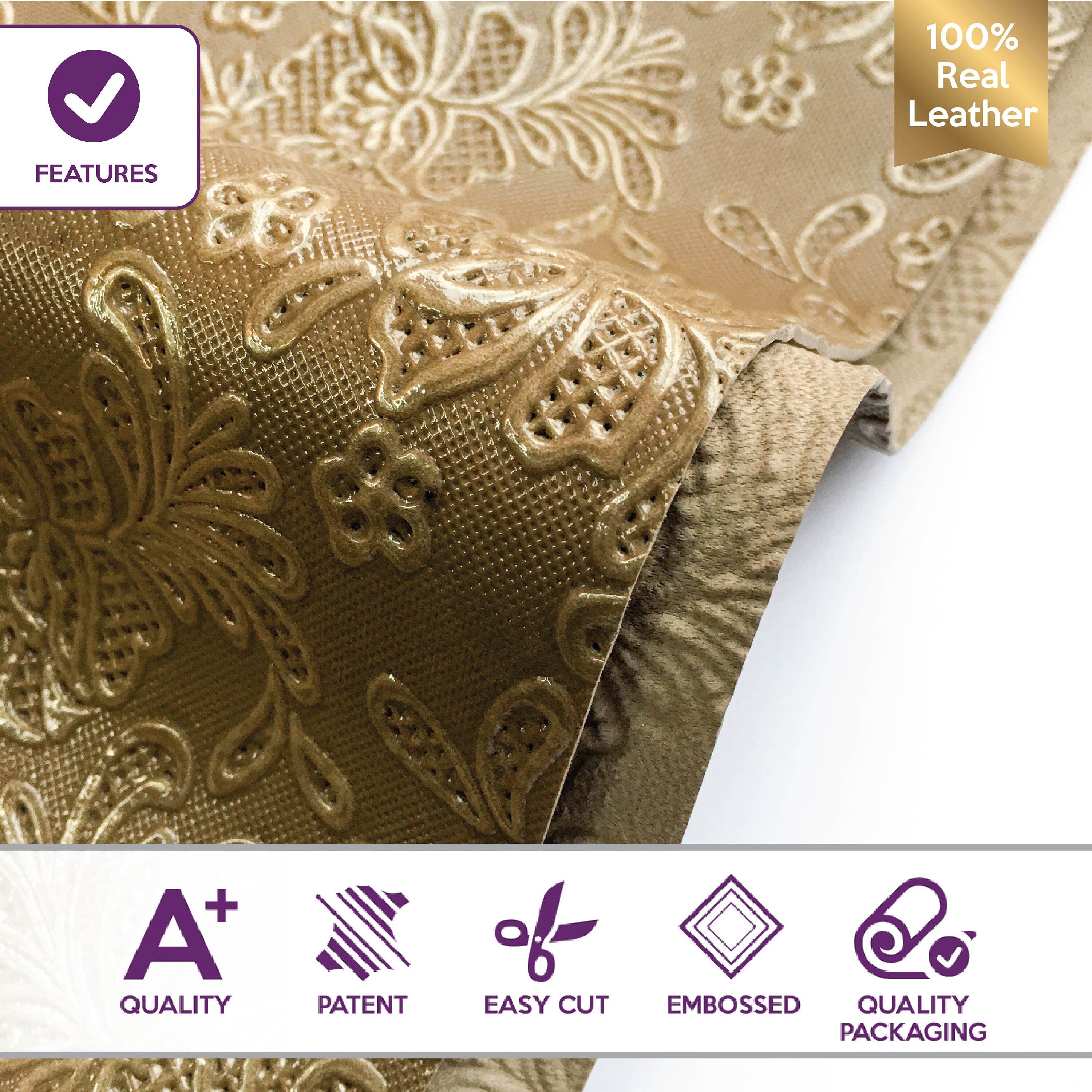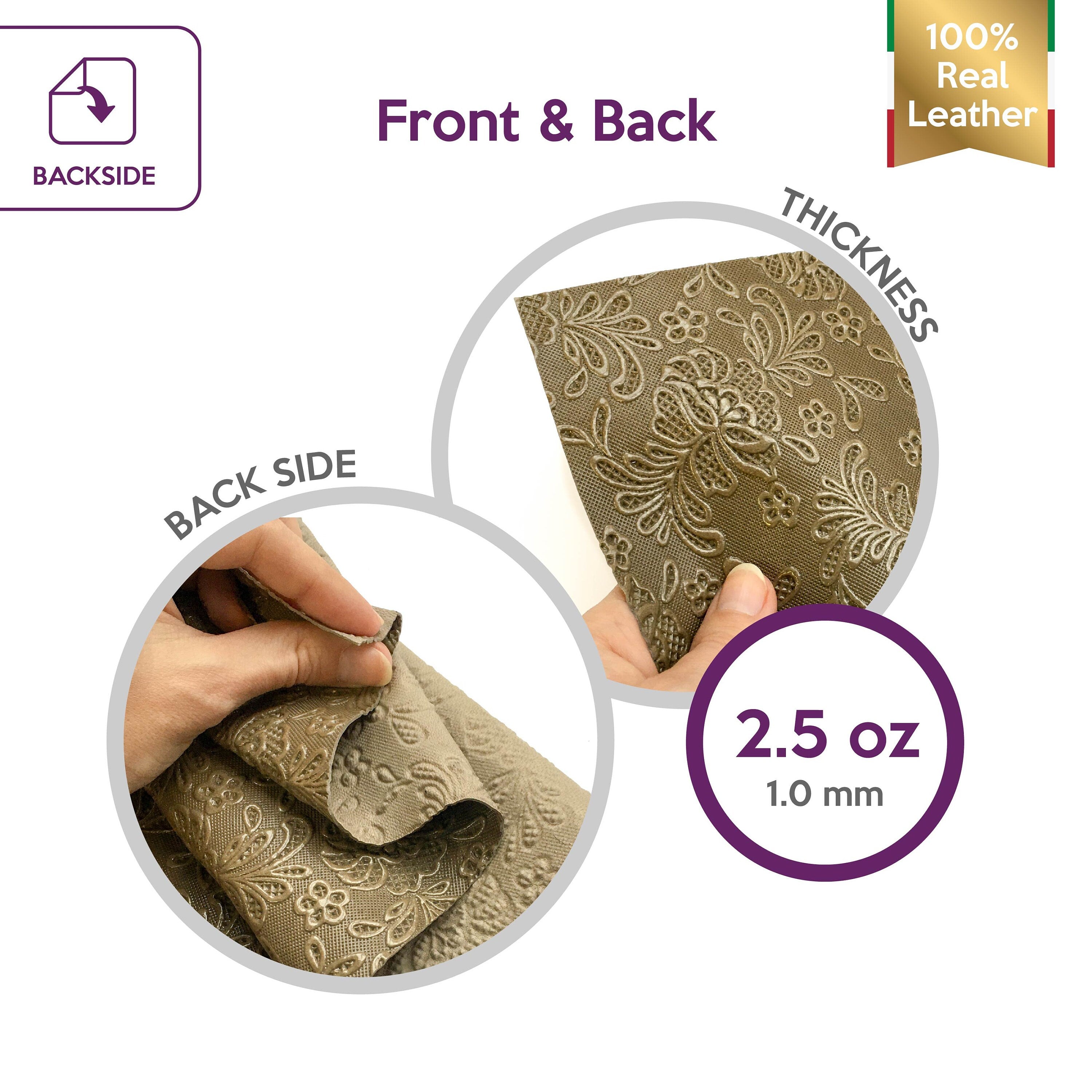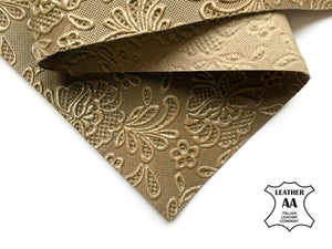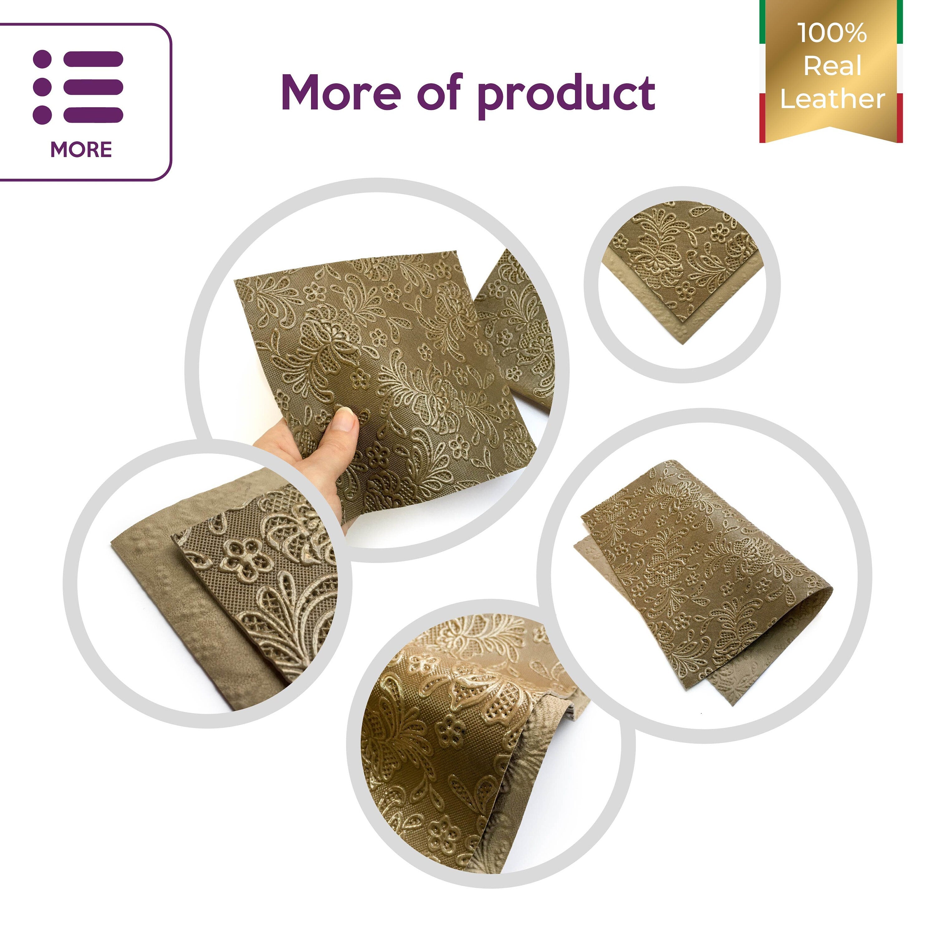 -Shiny lacquer leather print, covert green leather material sheets with embossed flower print. Very light pastel green color with brown shade in it. Leather pieces look like army/ khaki green but less intense.