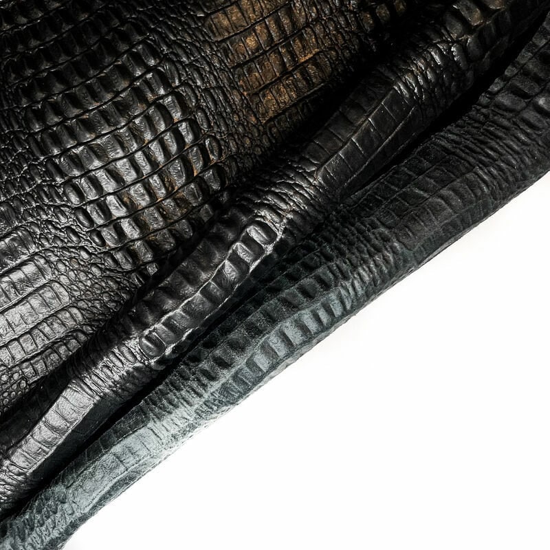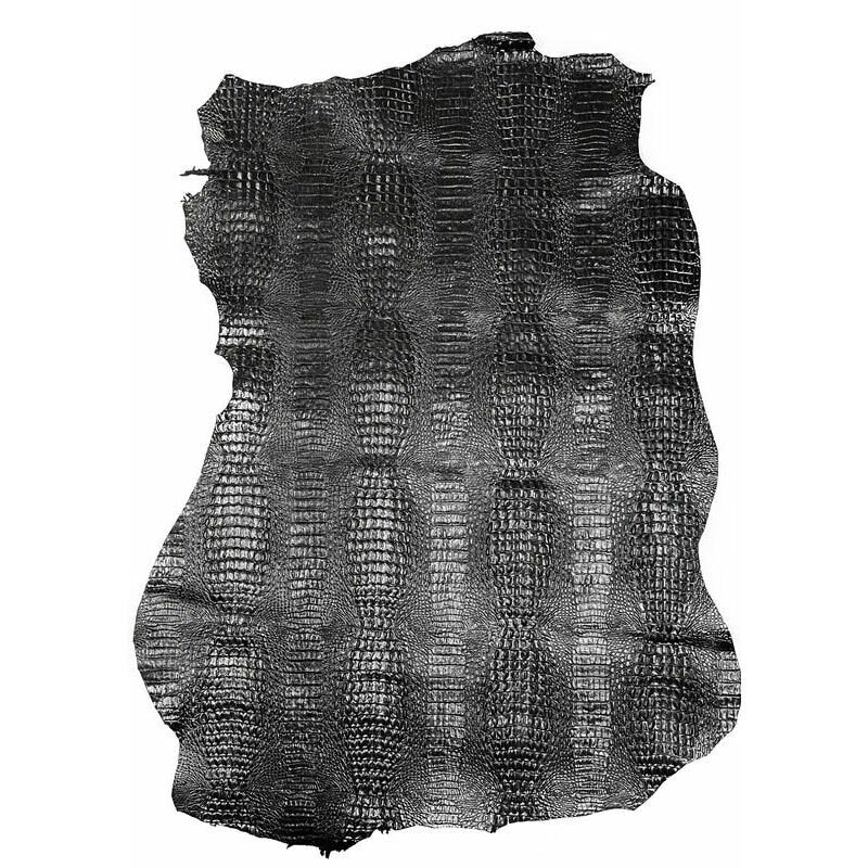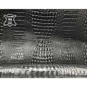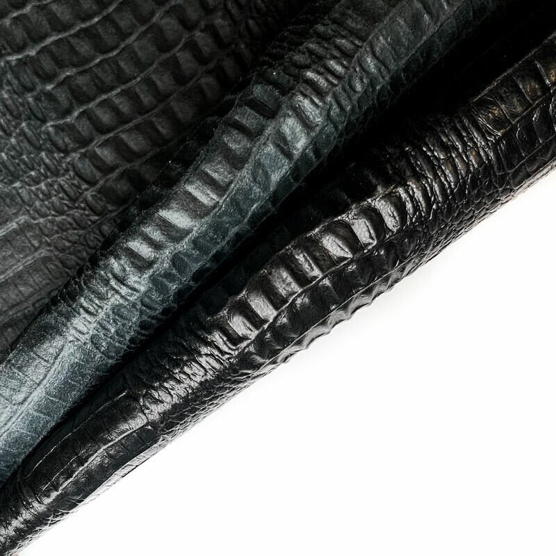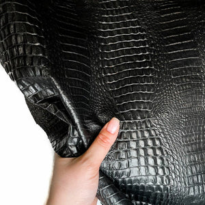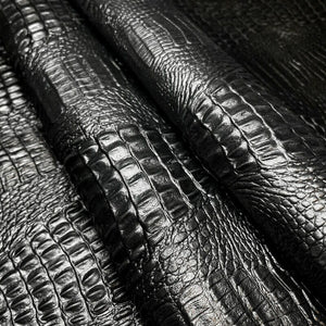 High-quality lambskin leather fabric hides in shiny black crocodile print all over.