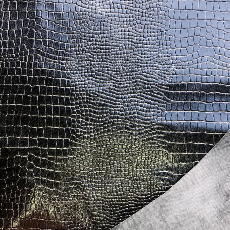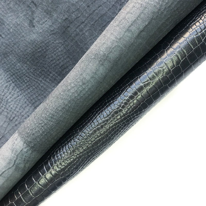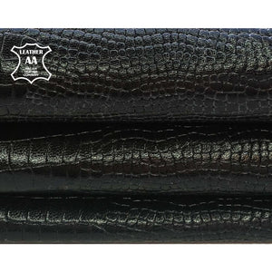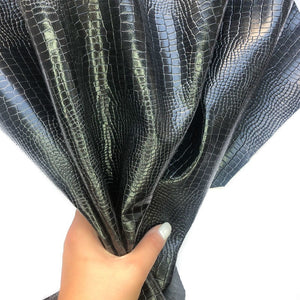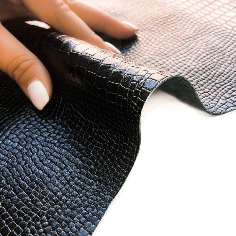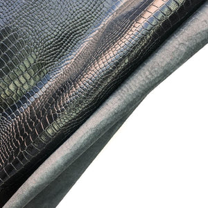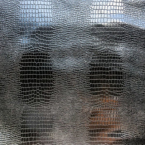 -Black leather hides with lizard print all over. Perfect patent material for shoes, bags and pants.