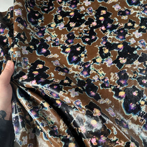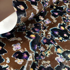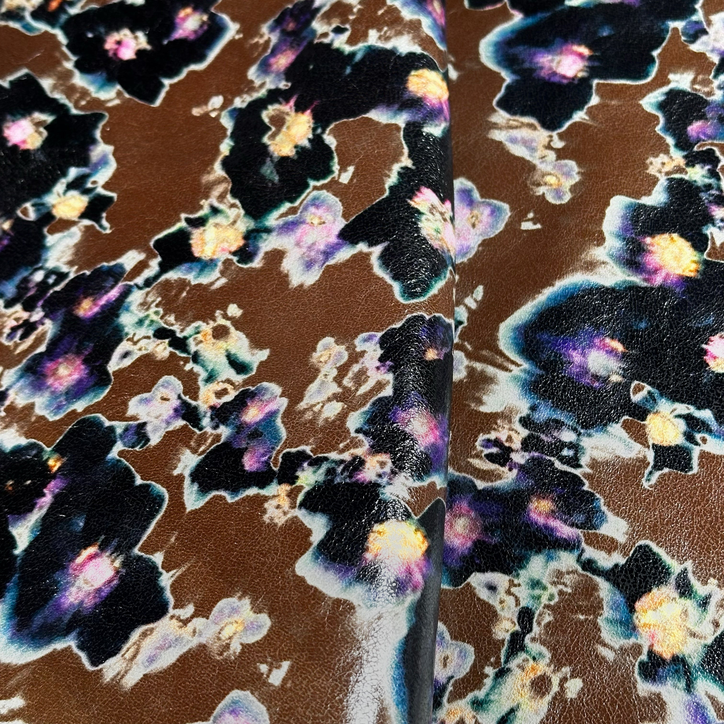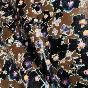 Shiny floral print on brown lambskin. Beautiful flower print leather hides-patent-like pieces.