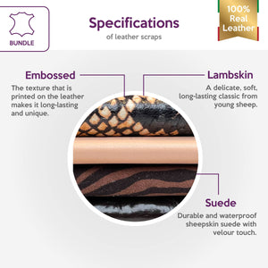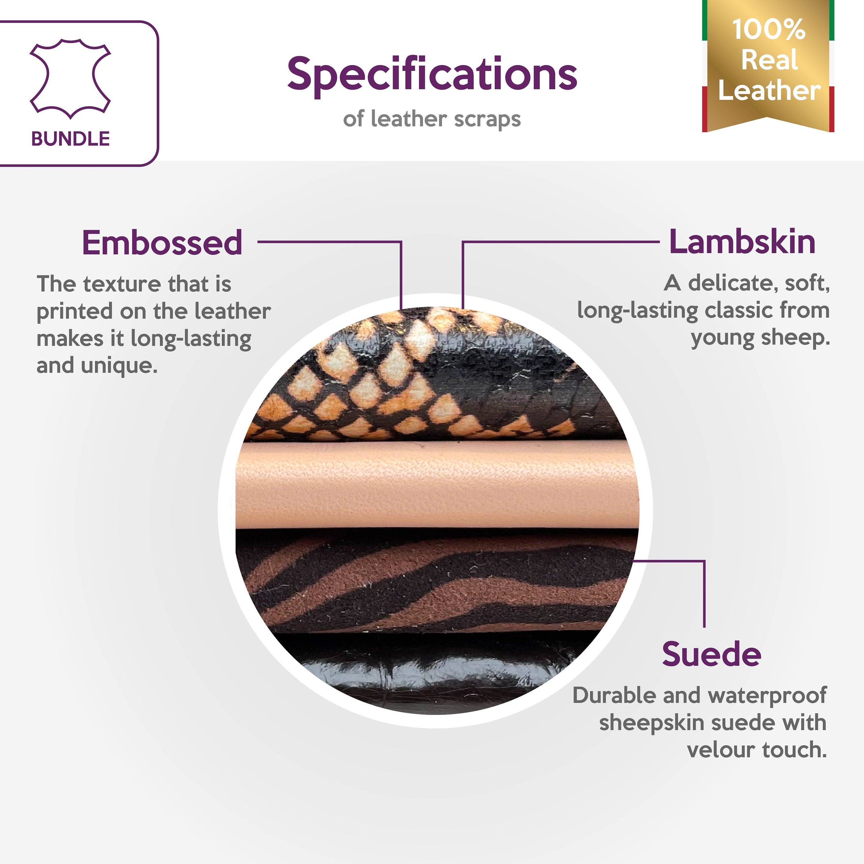 High-quality lambskin leather bundle of 4. Includes the softest sheepskin leather, the printed suede, and unique embossing.