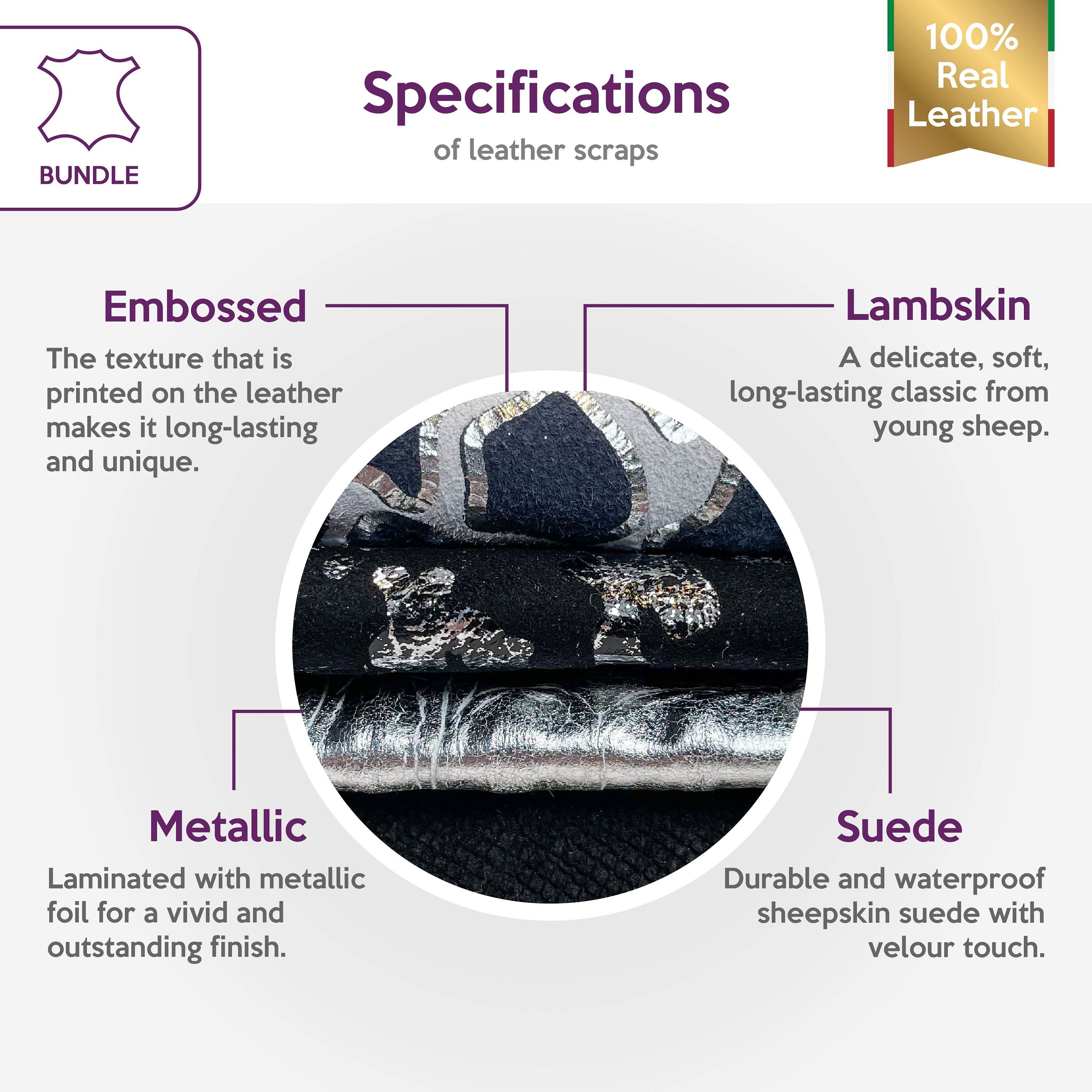 High-quality lambskin leather bundle of 4 FULL HIDES. Includes the softest sheepskin leather, the brightest metallic, and unique embossing.