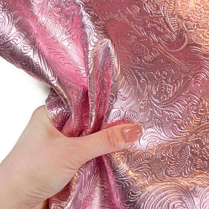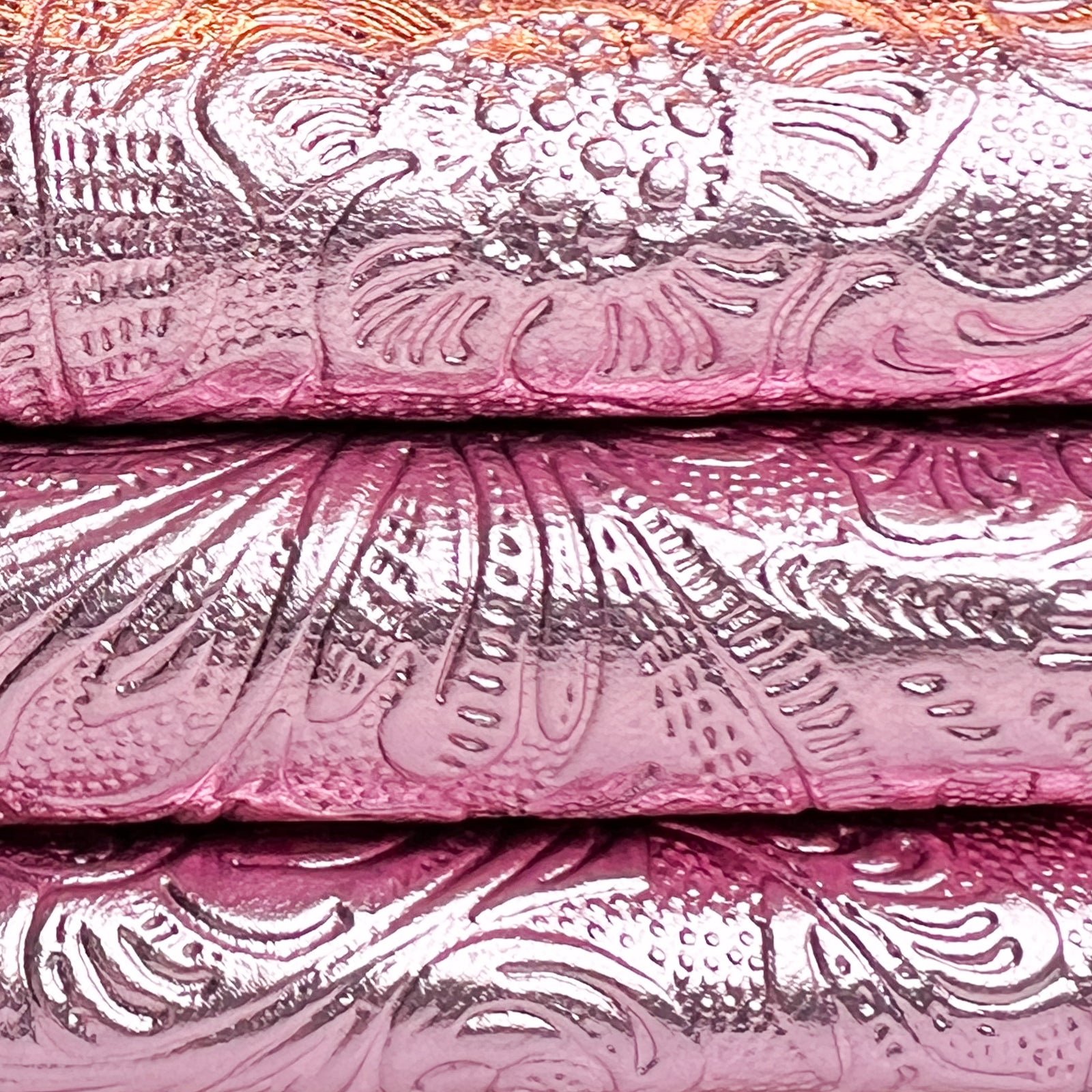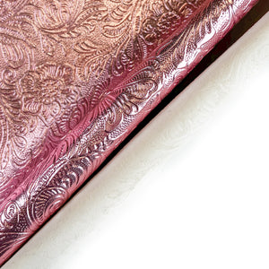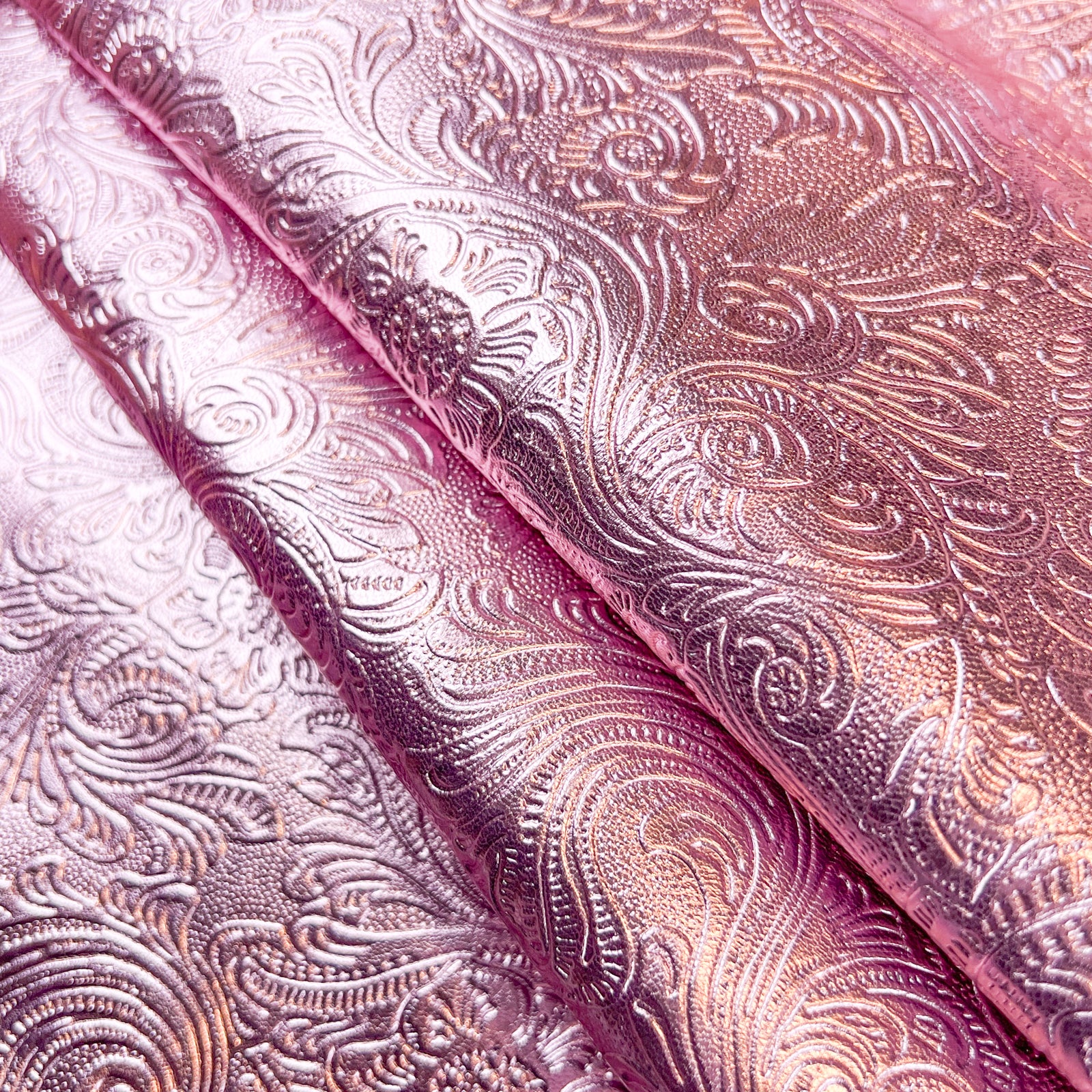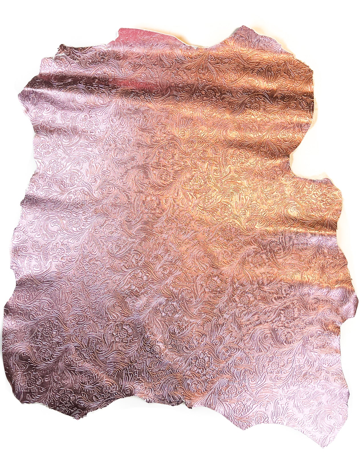Quality light pink lambskin with embossed floral print. Shiny metallic textured hides.