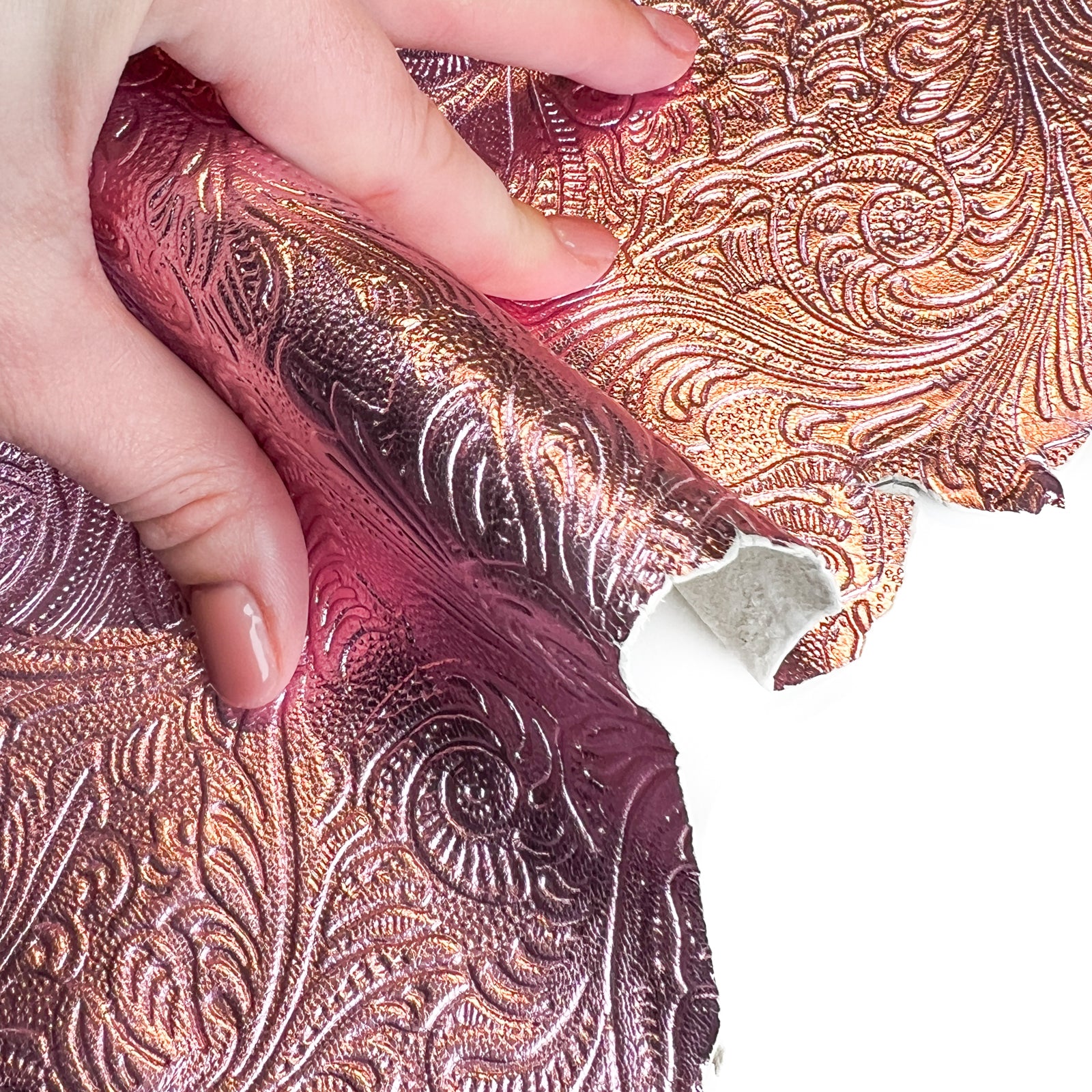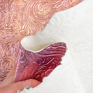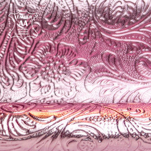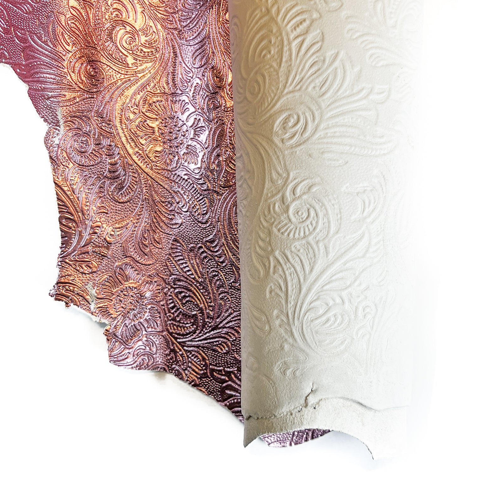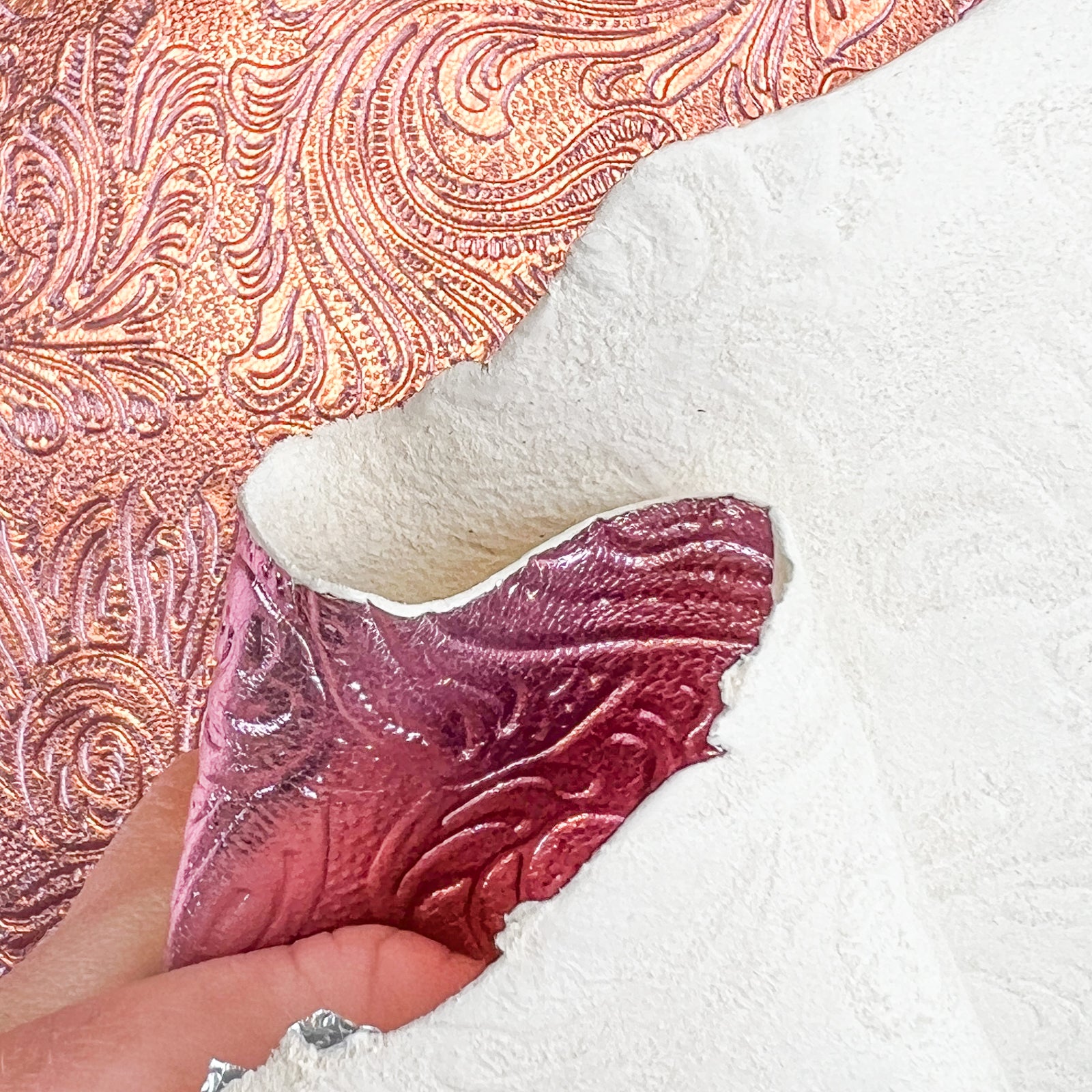 Quality light pink lambskin with embossed floral print. Shiny metallic textured hides.
