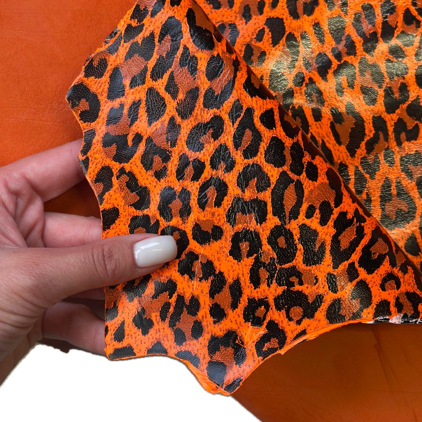 Unleash your wild side with this stunning, shiny orange lambskin leather featuring a bold leopard print pattern! Soft, supple, and eye-catching, these premium leather pieces are perfect for all your creative...