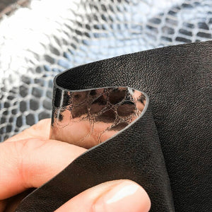 Metallic foil with snake print leather pieces. Exotic animal print for luxury. Natural lambskin hides from the best Italian tannery. Perfect leather for sewing. Name: Mirror Snake Code: 972 Ā  Color:...