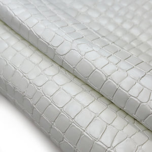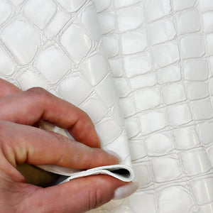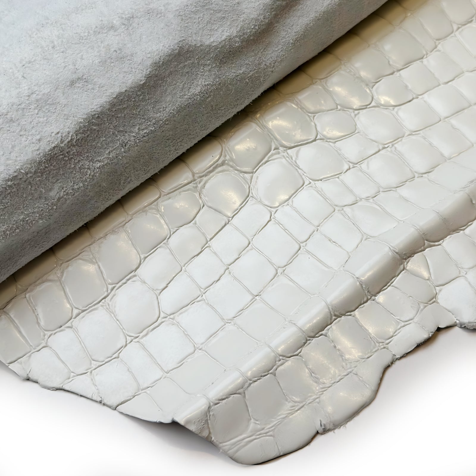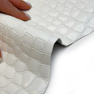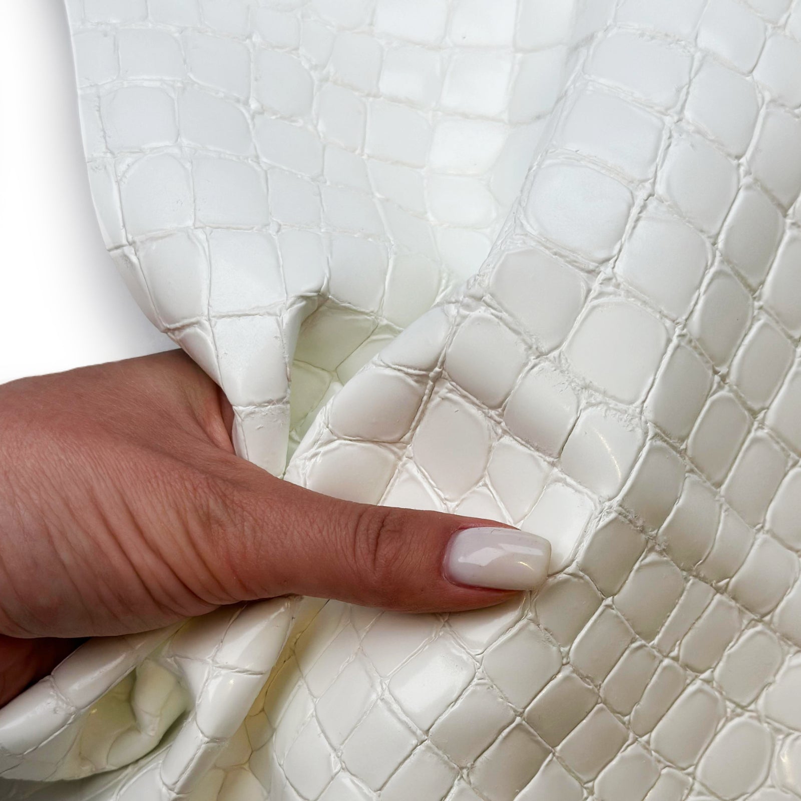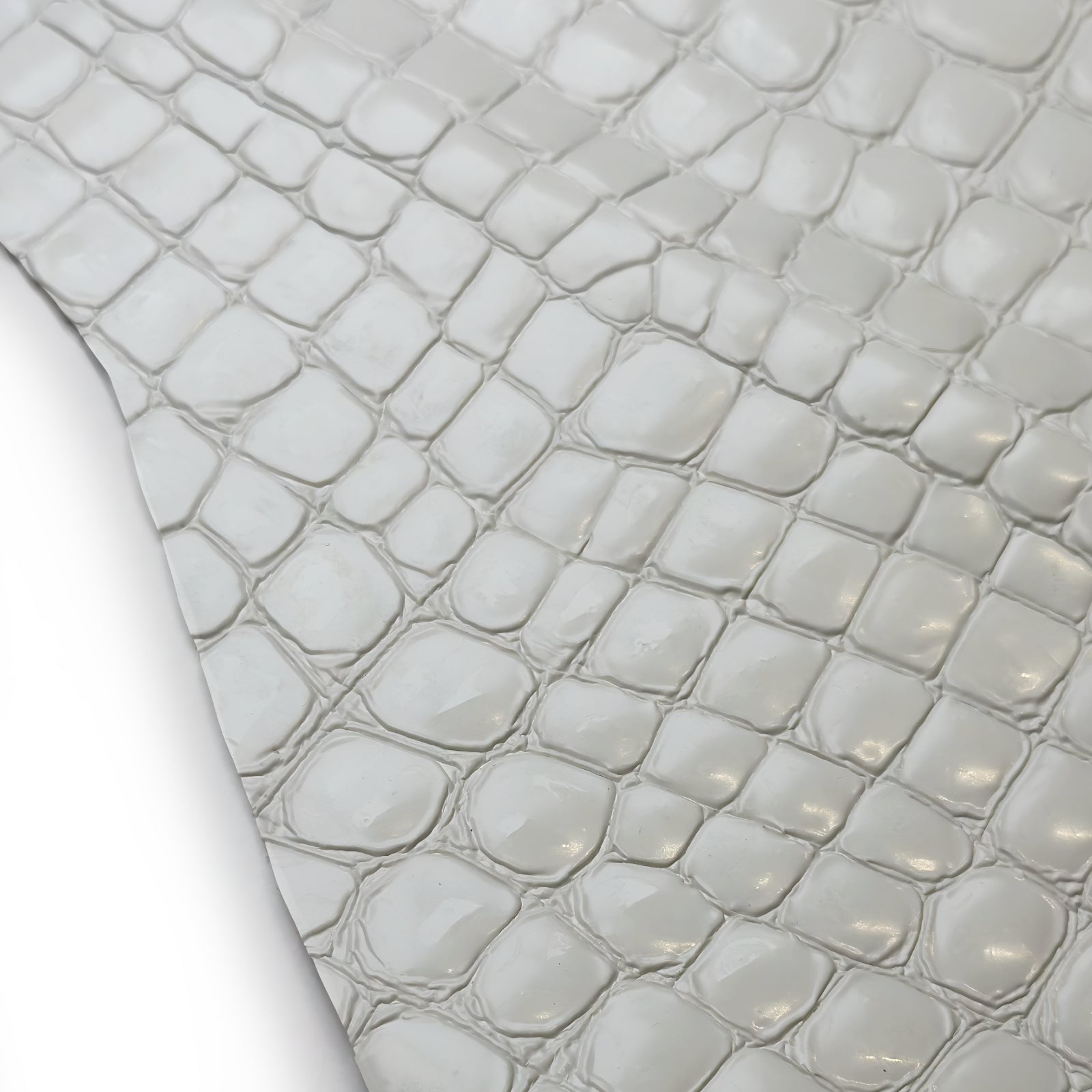 White patent lambskin with embossed crocodile print. Thick sewing leather.