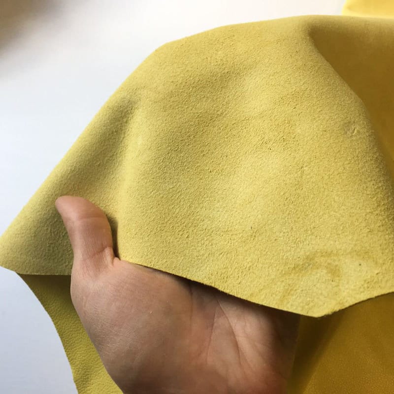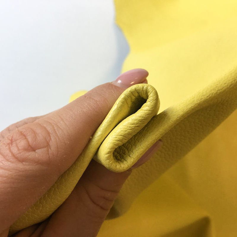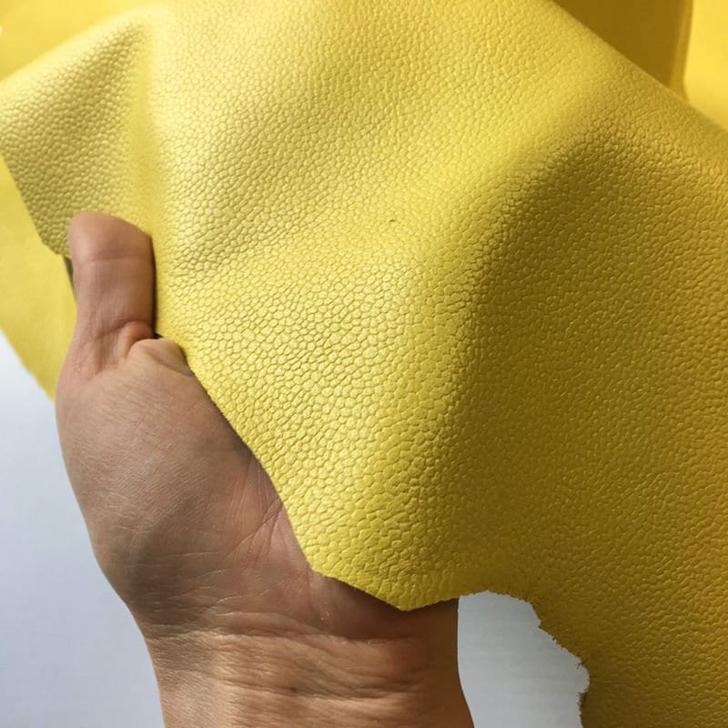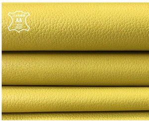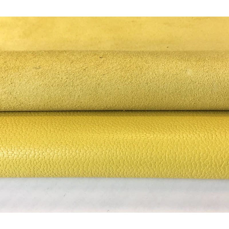 -YELLOW textured leather fabric, colored throughout, deep coloring, bright and rich color. Quite thick but soft leather skins. Sell in full hides. Firm and high quality leather pieces. Has this little water drop texture. Try it!