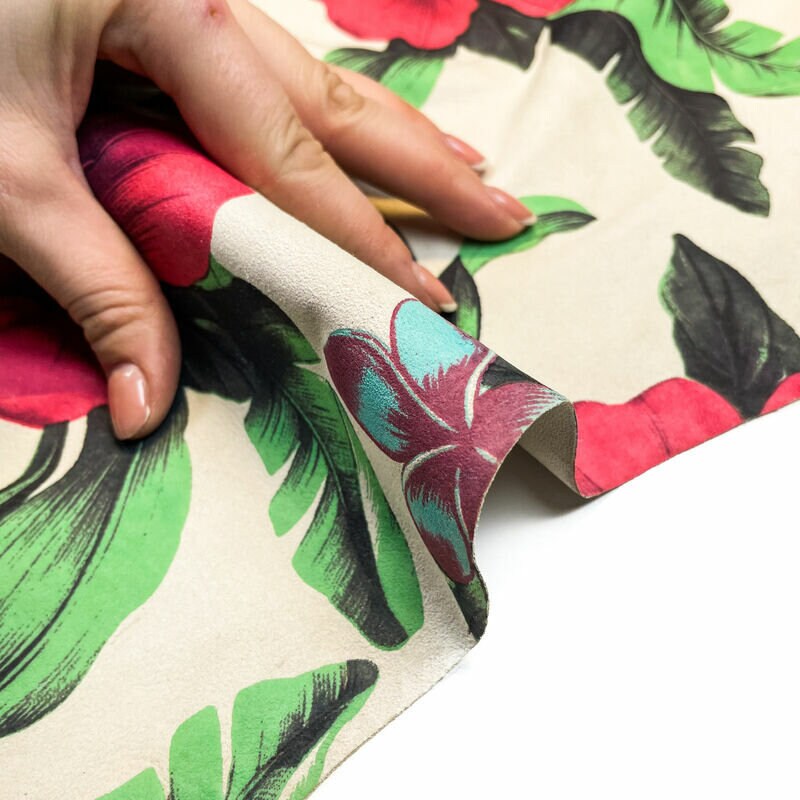 - Beige suede leather with flower print. Unique leather with hawaii flowers all over the hides. Soft and thin leather for sewing.